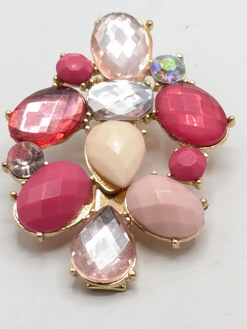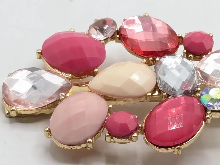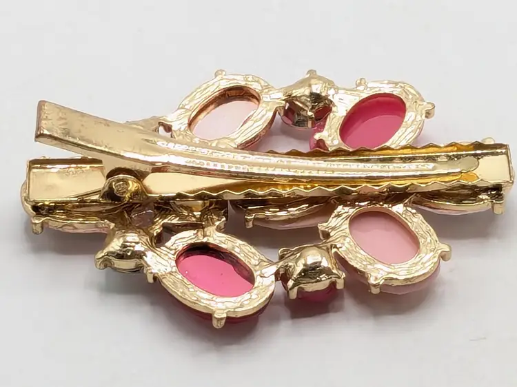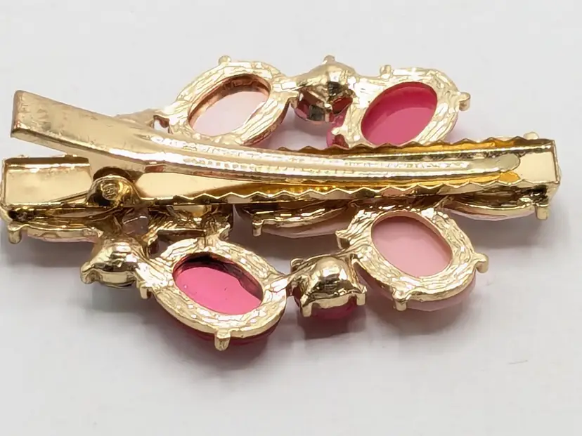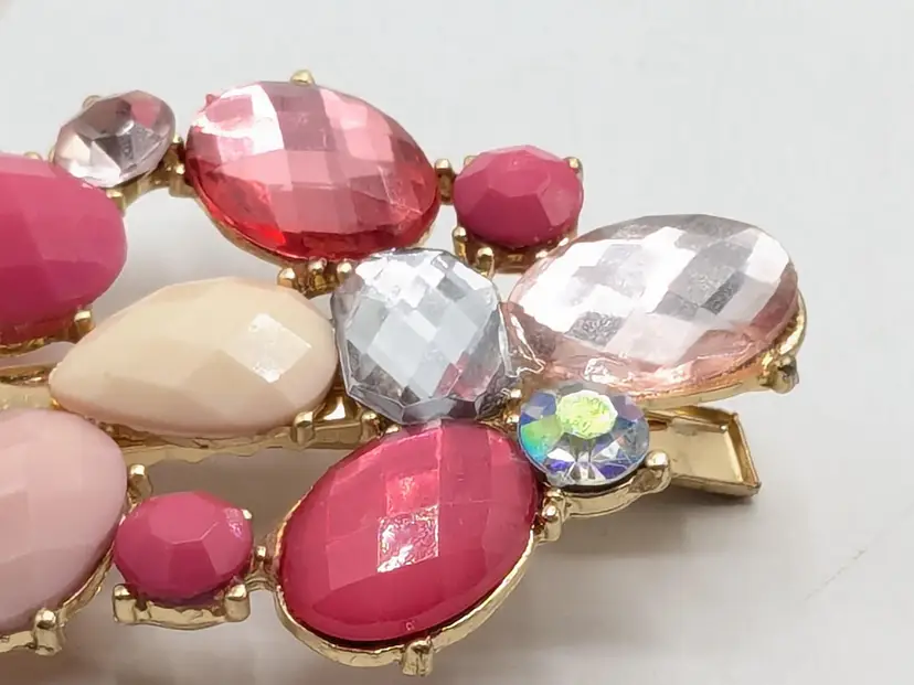 Good condition. Features shades of pink. Gold-tone setting. Hair clip. Measures 2 3/4" length and 2" in height. (EN1)