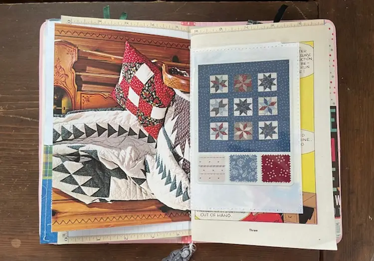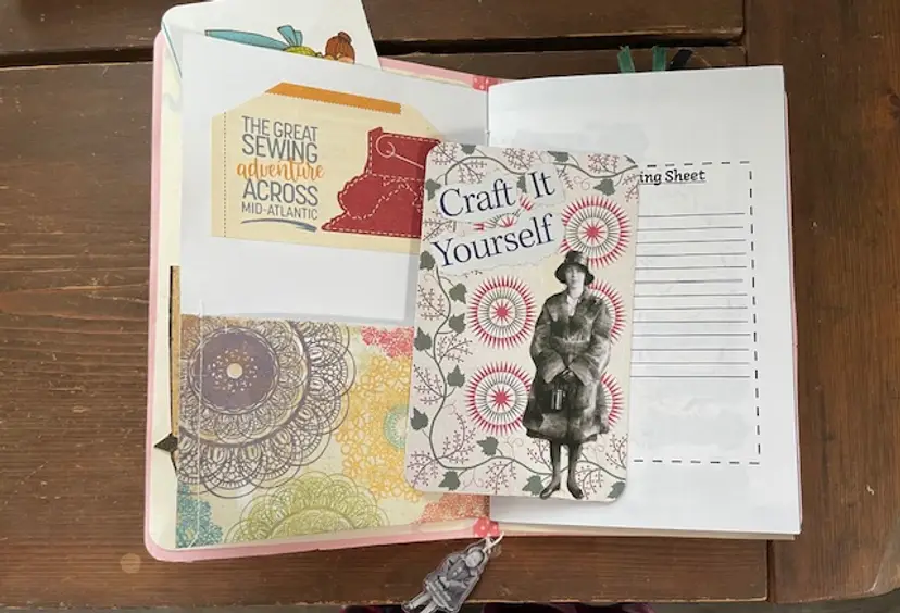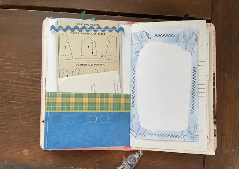 Soft cover; single signature journal. 9x6”. 54 pages; photo sleeves, project planning sheets and lots of pockets; cute headband closure.