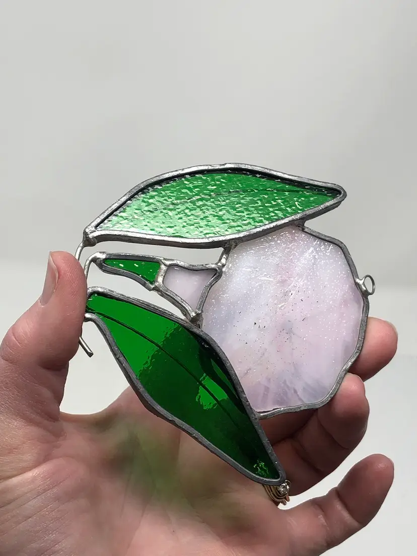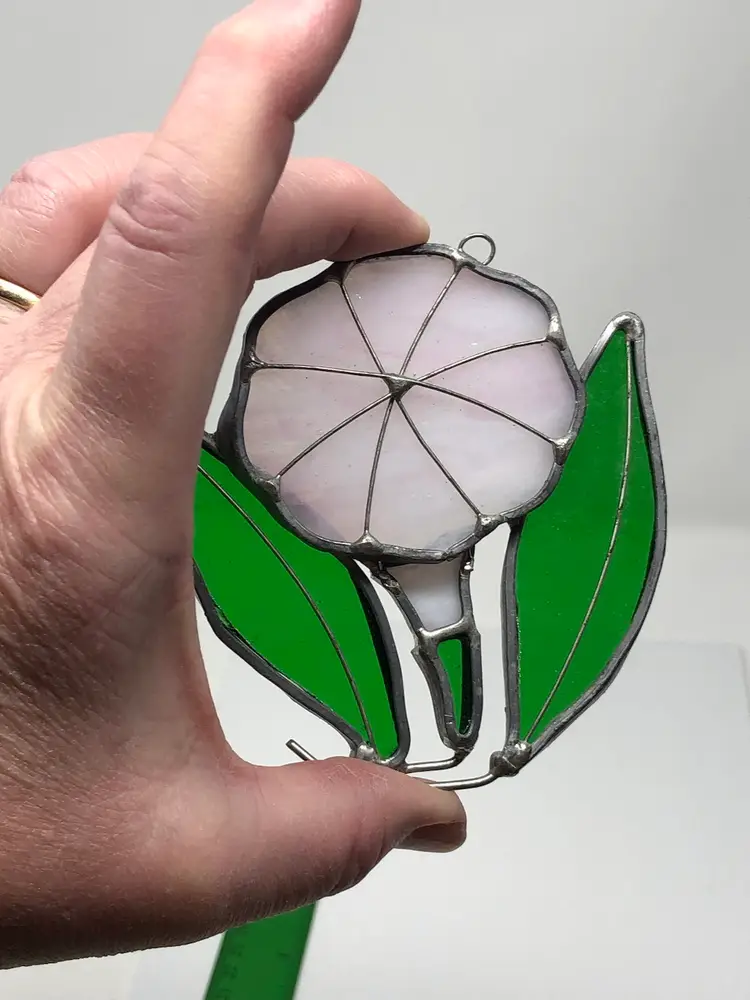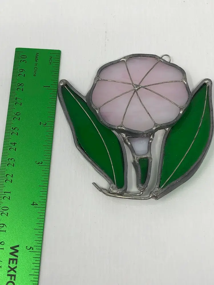 4" stained glass suncatcher of a pearly pink iridescent glass flower with two green leaves and wire detail. Loop for hanging, no chips or cracks, no markings or labels