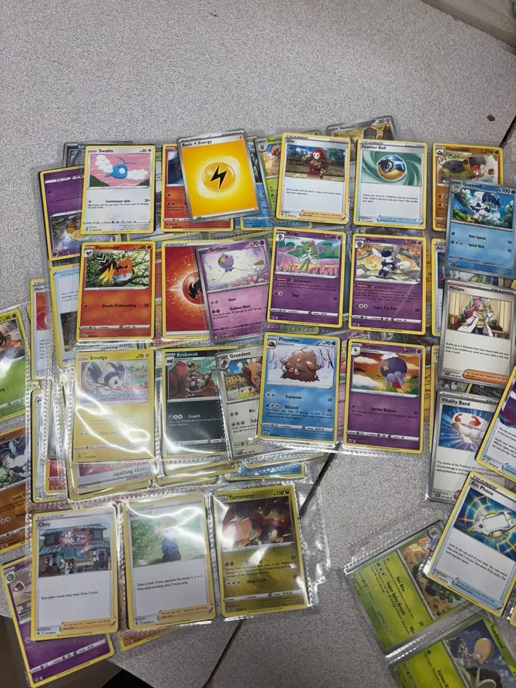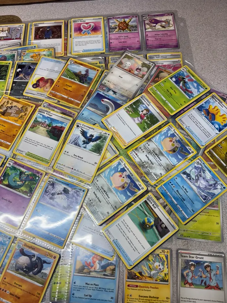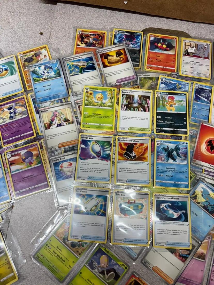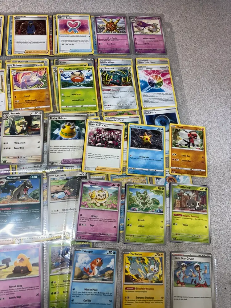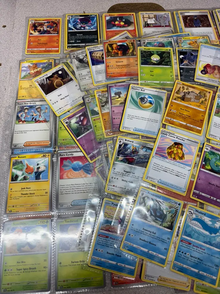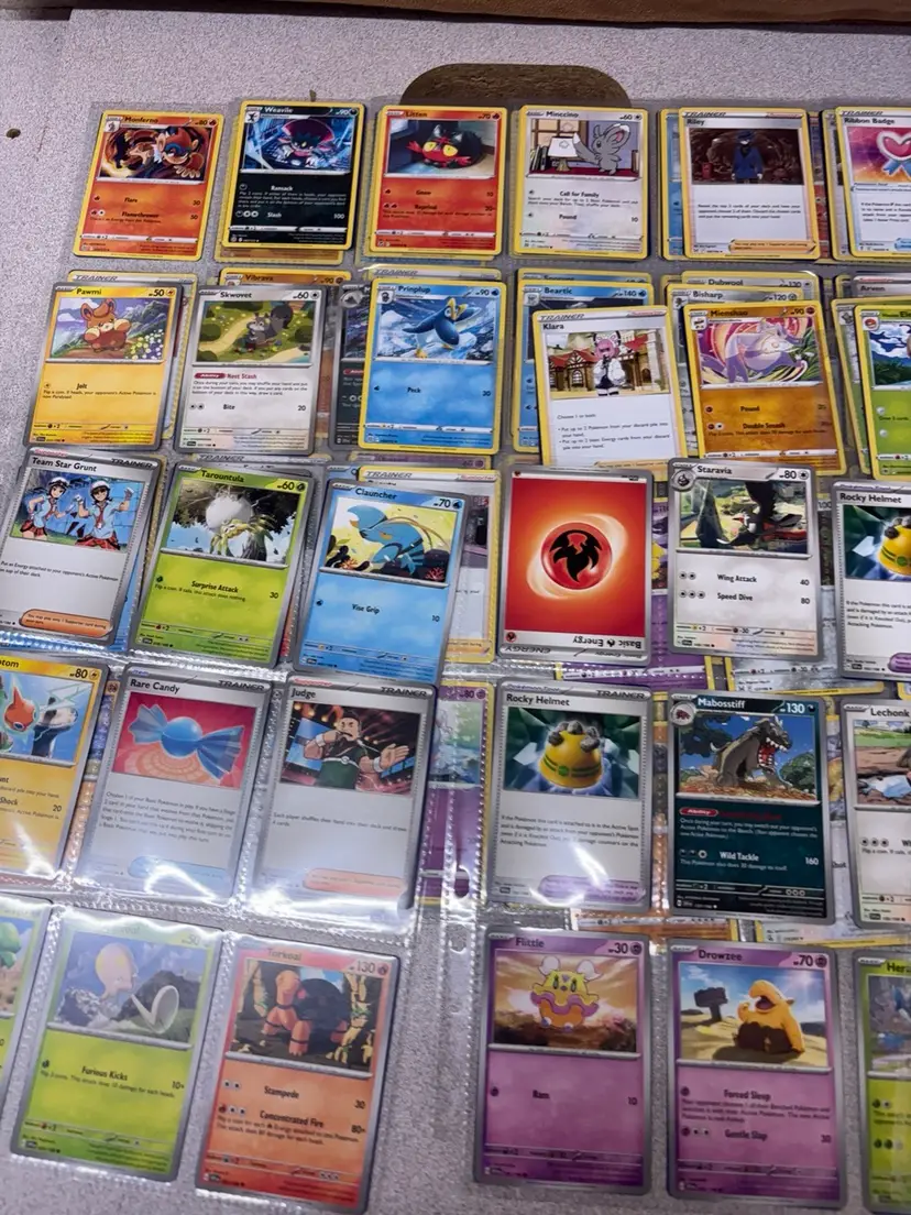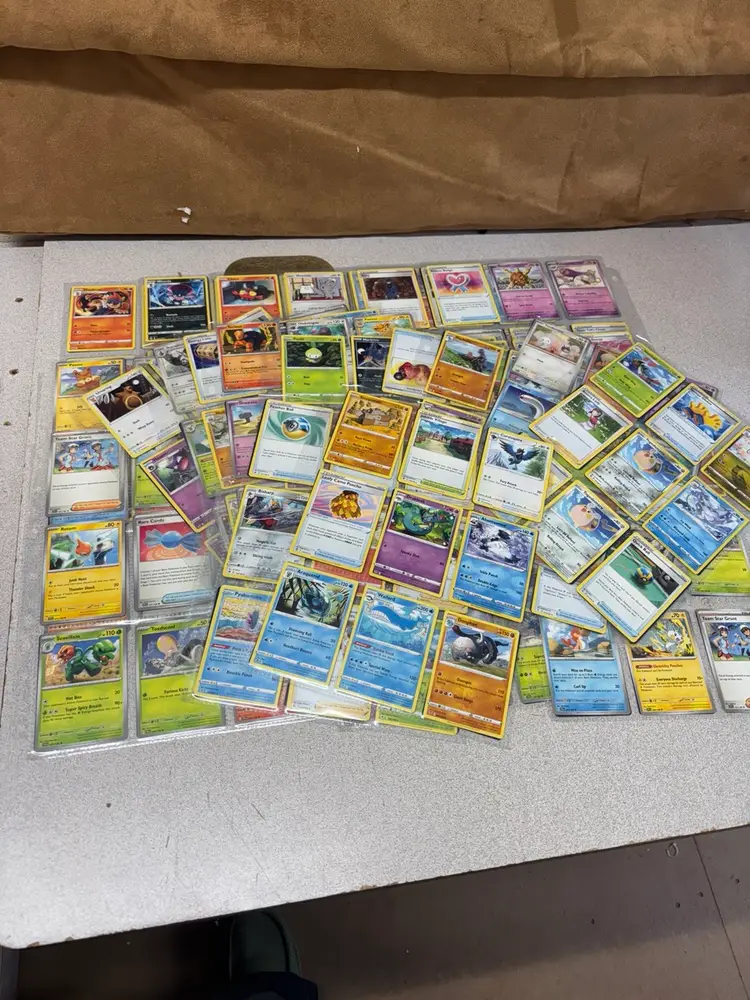 Lot of 48 Pokémon cards stored in 24 protective sleeve sheets. Includes a mix of Pokémon types, trainers, and energy cards across different sets and generations. Cards feature both basic and evolved Pokémon, with a few reverse holos and specialty cards included. Great for players, collectors, or bulk resale. Cards appear to be in good played or lightly played condition—sold as-is with no individual grading.