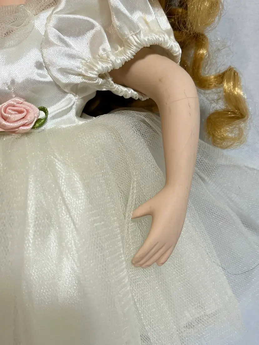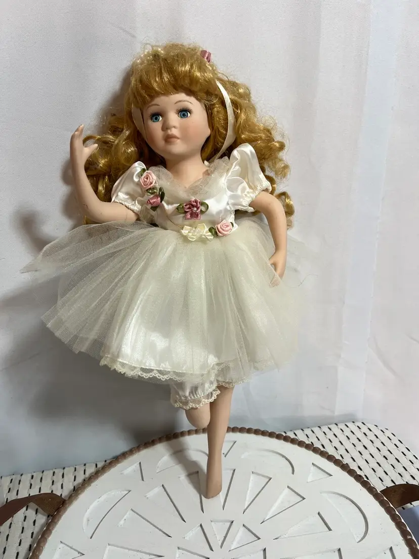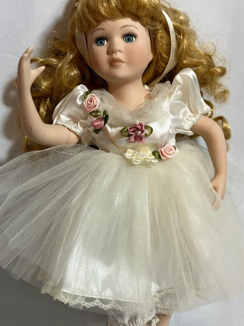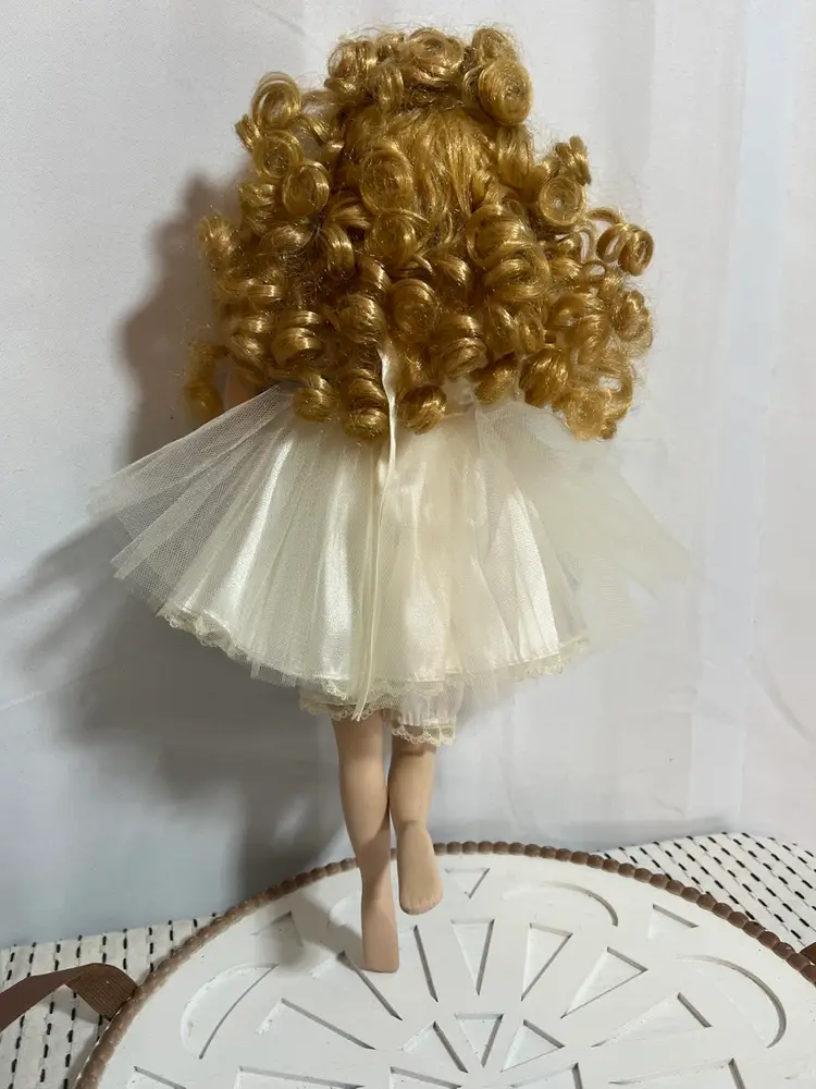 Blonde curly hair, blue eyes wearing a cream color ballerina dress with satin bloomers. Missing ballet shoes. Minor marks on arm No breaks/cracks No holes