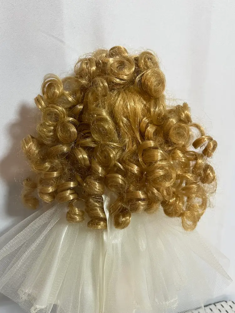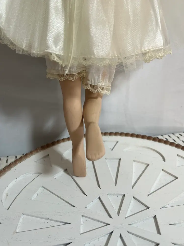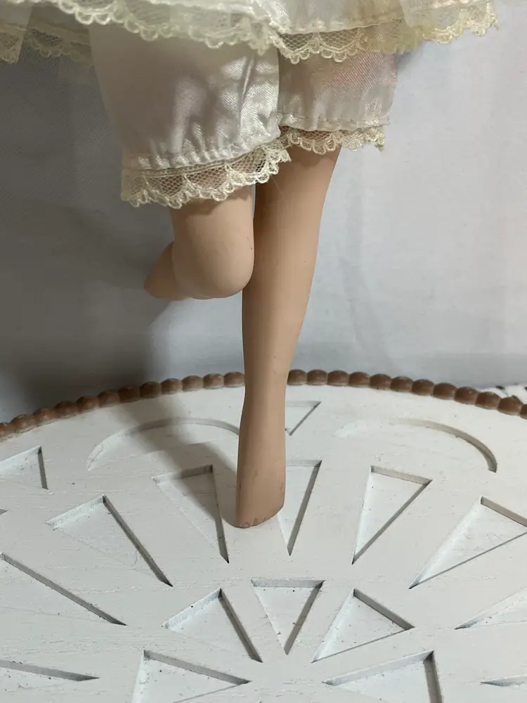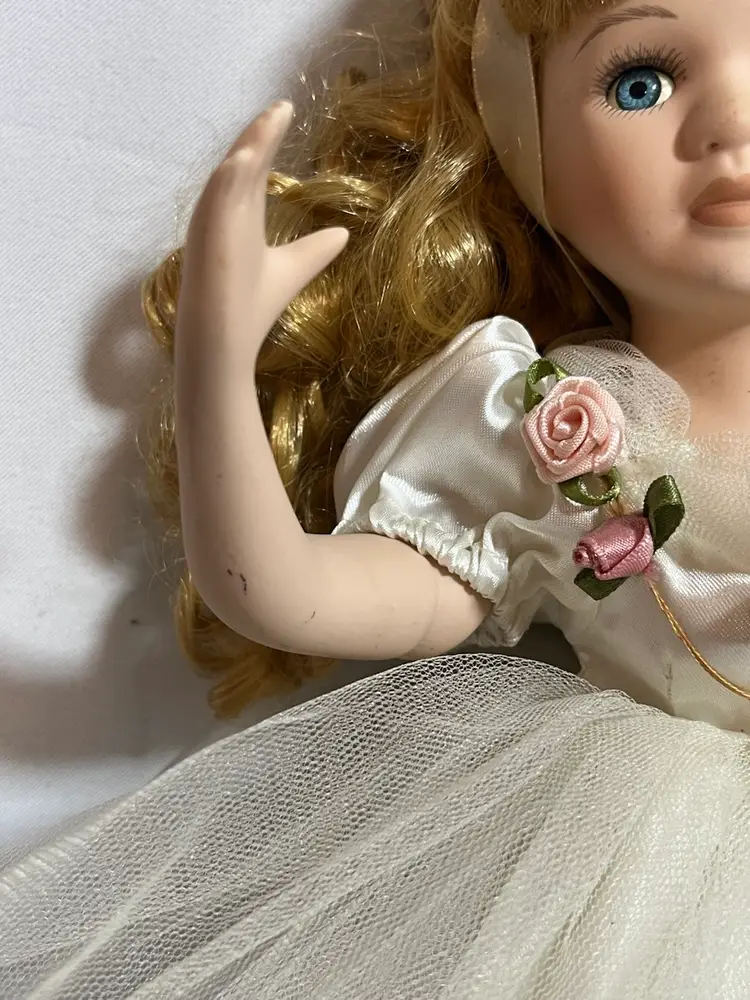 Blonde curly hair, blue eyes wearing a cream color ballerina dress with satin bloomers. Missing ballet shoes. Minor marks on arm No breaks/cracks No holes