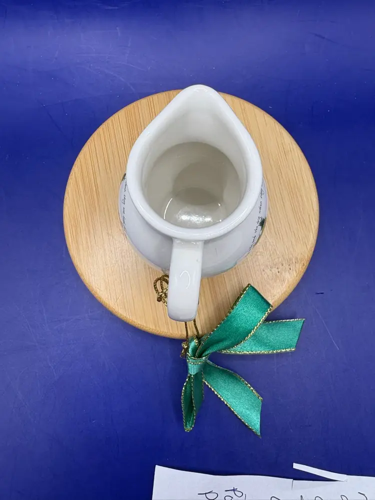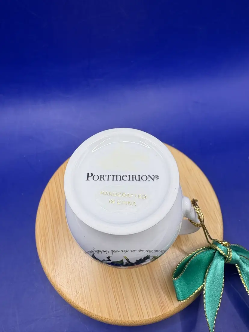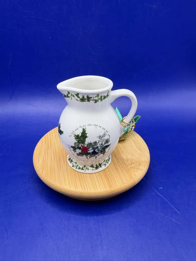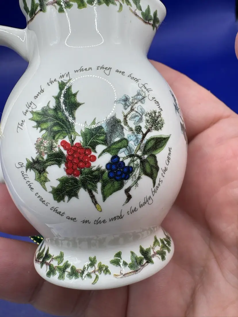 Portmeirion Jug Pitcher Ornament Featuring Holly and Ivy (18th century English Christmas carol ) Part of the lyrics surround leaves Measures 3 inches tall by 2 1/2 inches at widest In excellent condition