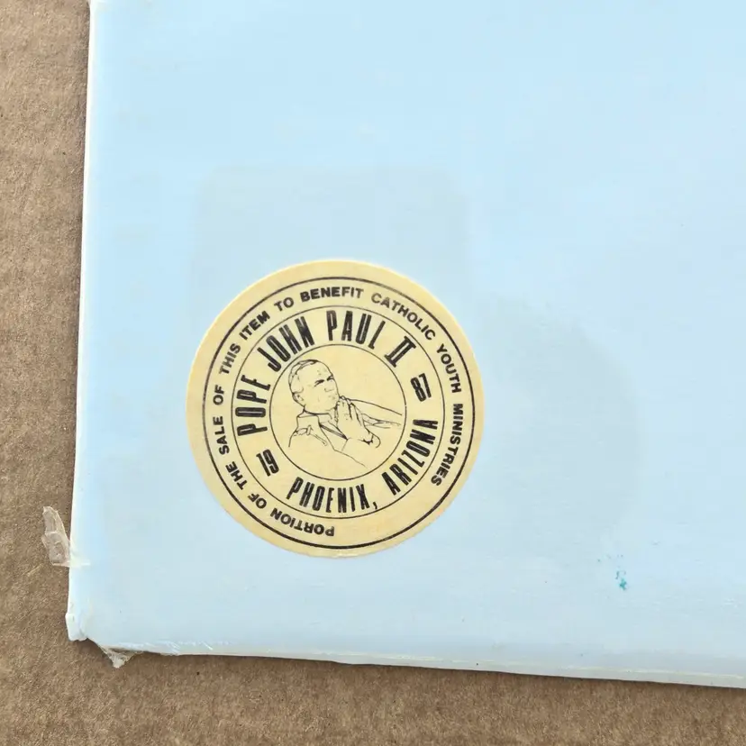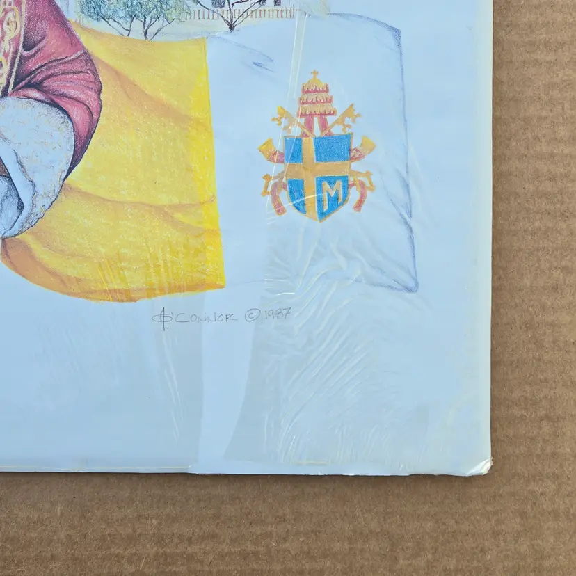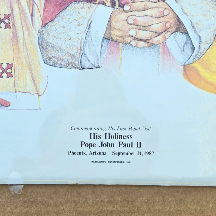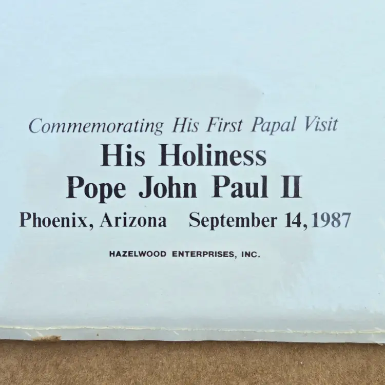 Poster Pope John Paul II 1987 Papal Phoenix Arizona Visit Tour 15×20¾" with Sticker in torn cellophane. Used condition in that the cellophane surrounding the poster is torn in places, edgewear, poster shows that it is partially wrapped around backing board. Please view all the photos and please ask any questions prior to purchase when possible.