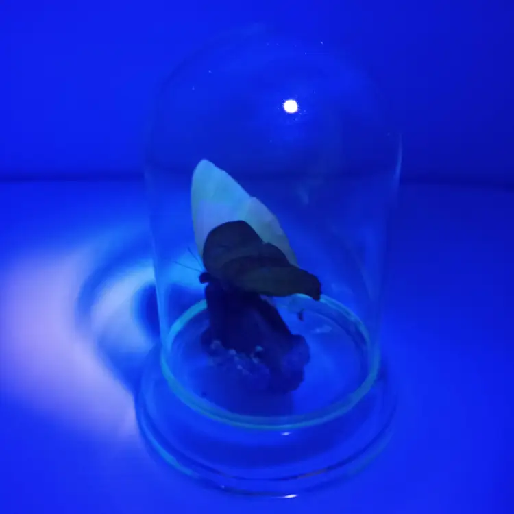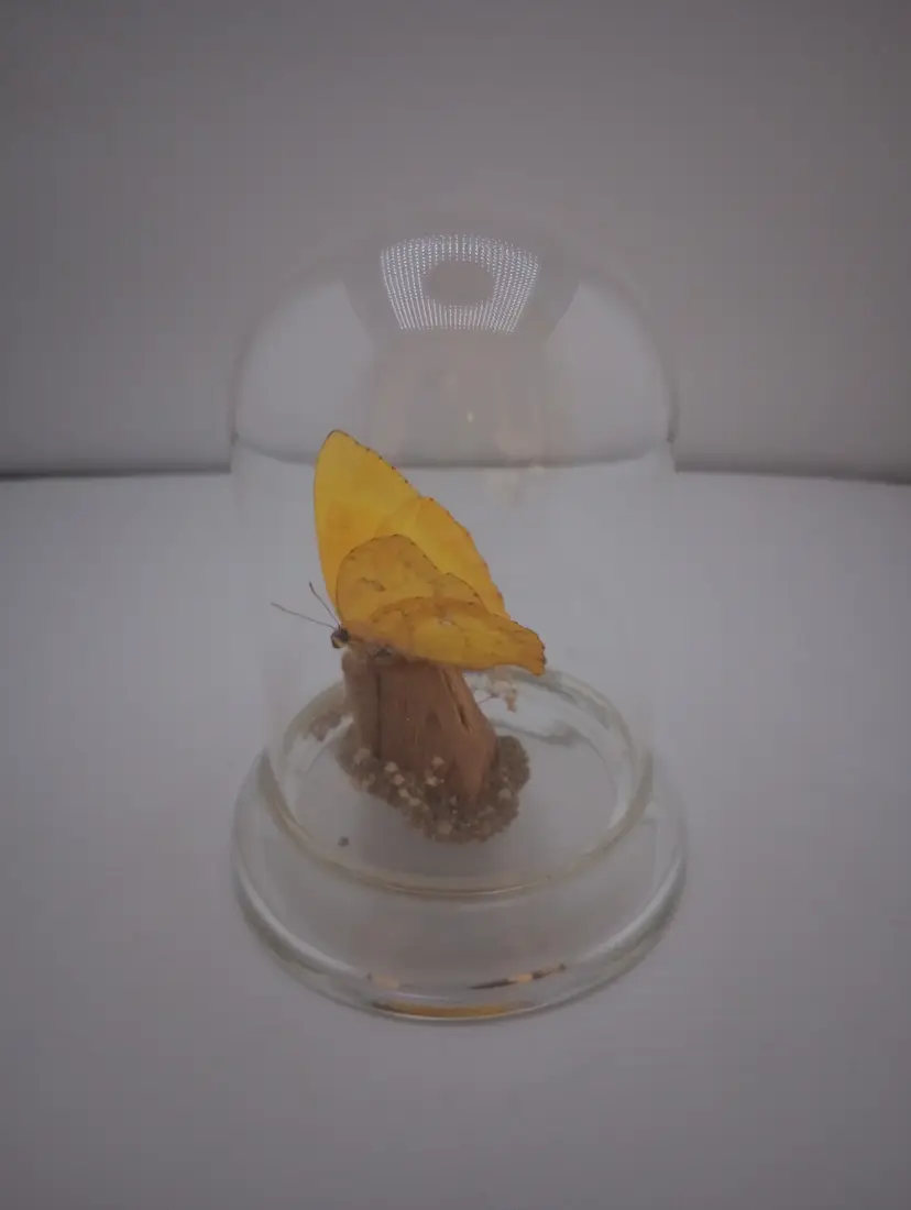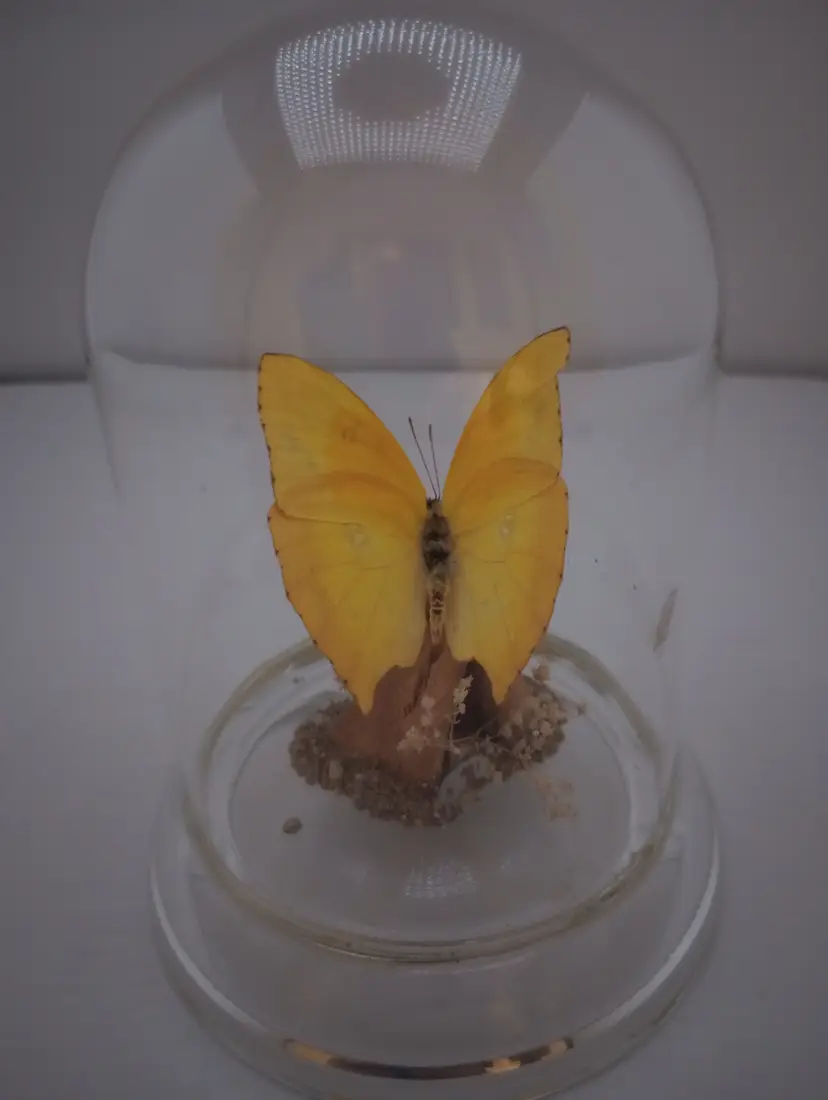 This is a beautifully preserved yellow butterfly under a glass cloche. The base of the cloche has a little glow.