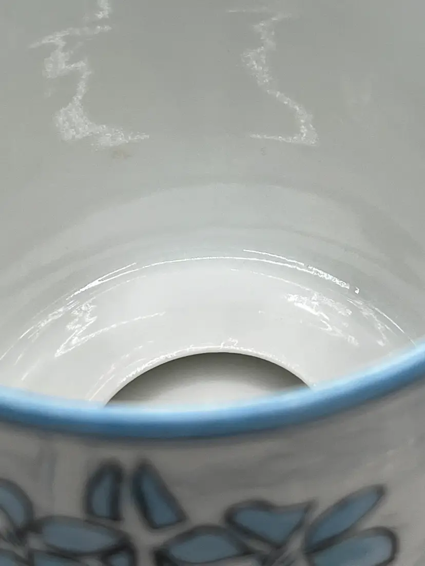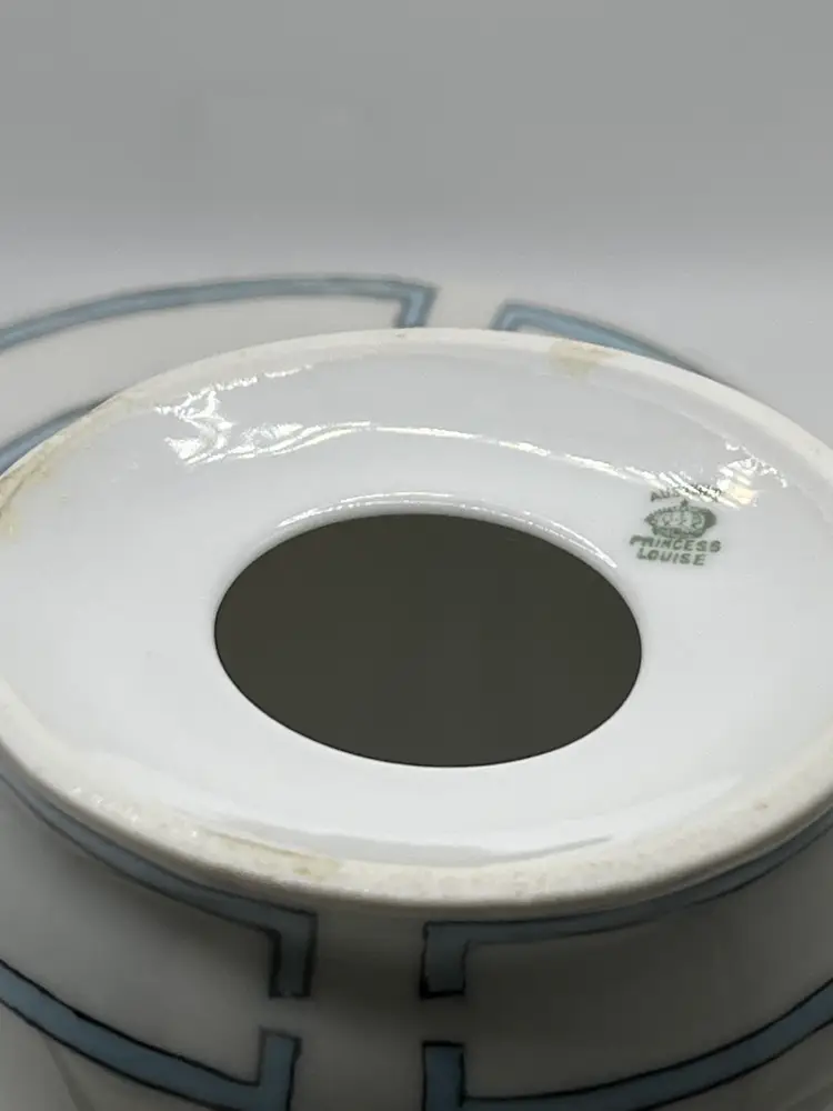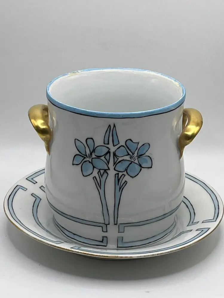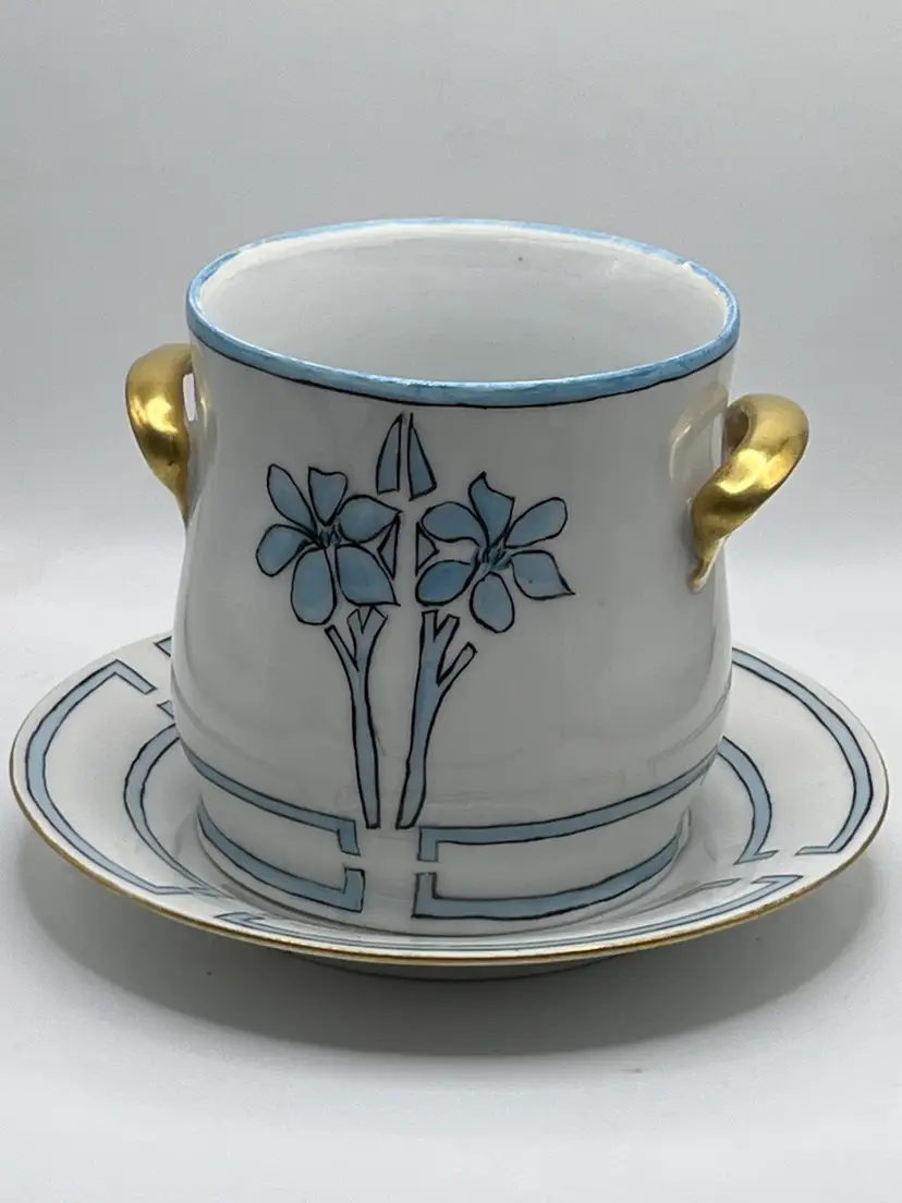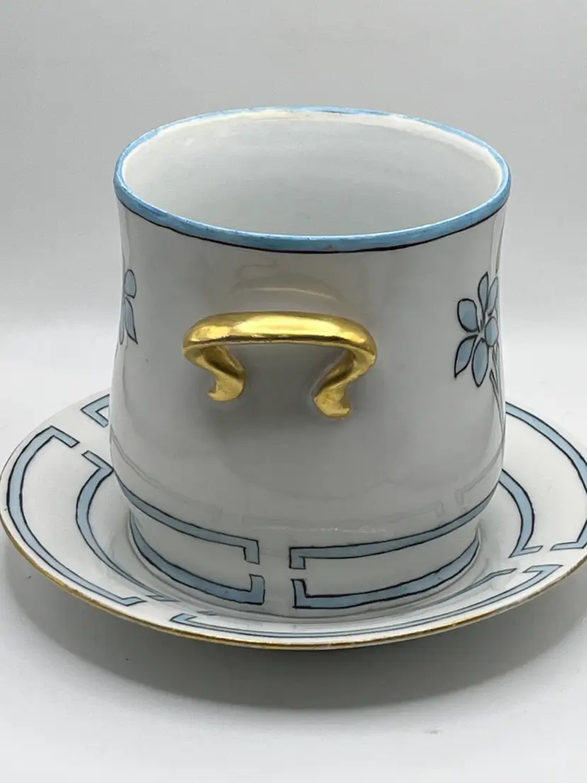 Vintage Princess Louise Condensed milk container with saucer, no lid. The cup is white with two gold handles and features a design of light blue flowers with black outlines, along with horizontal light blue lines and black outlines near the base. The saucer is white with a matching light blue and black outline design and a gold rim. It is likely the "Princess Louise" condensed milk tea set, based on the user's description and the distinctive design elements. These sets were popular in the early 20th century and are characterized by their unique shape and decorative style, often featuring floral motifs and geometric patterns. Condensed milk cups were specifically designed for serving condensed milk, which was a common ingredient in tea and coffee during that era. In EUC Measures about 5 1/2" high.