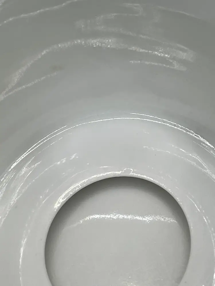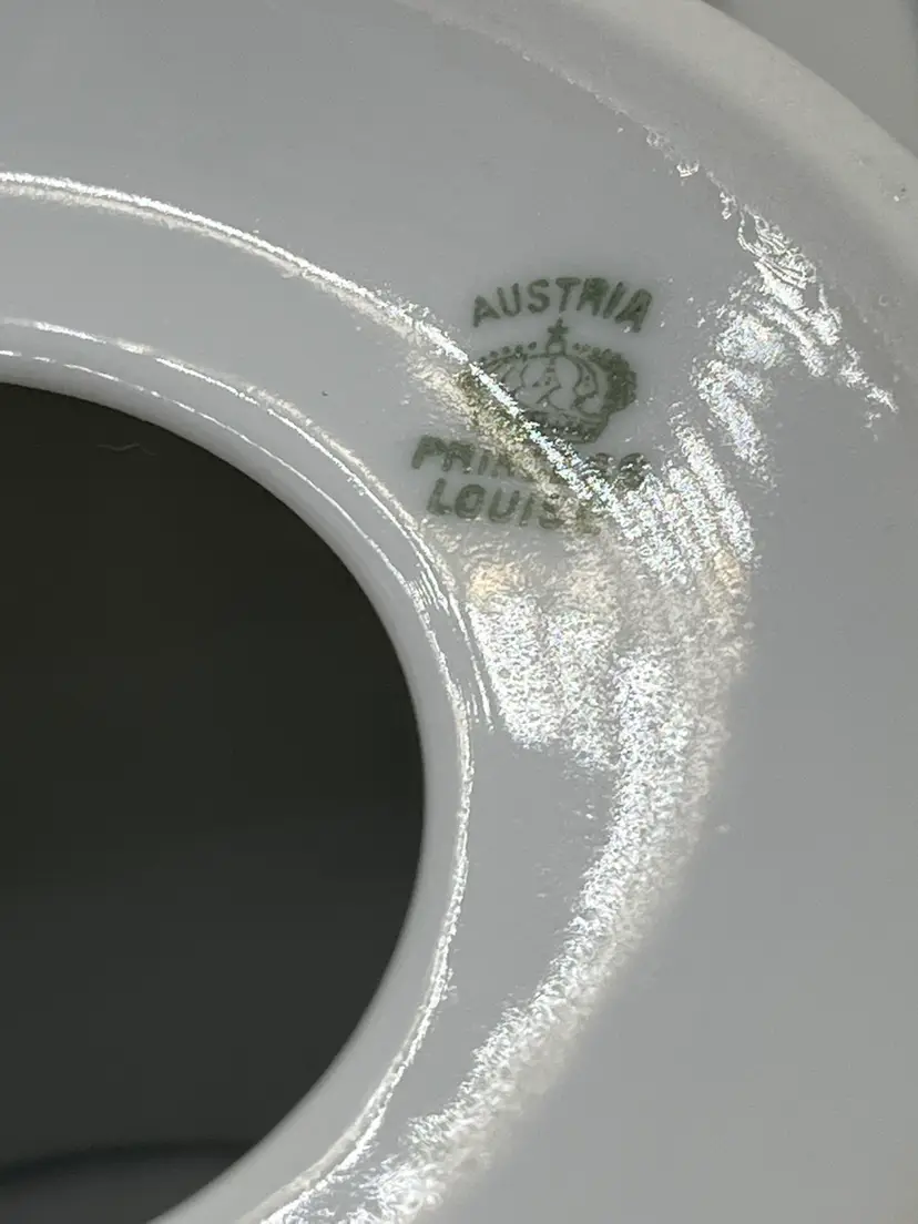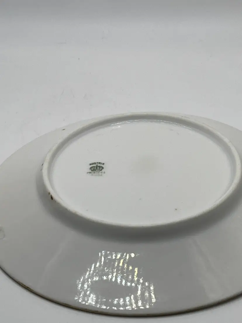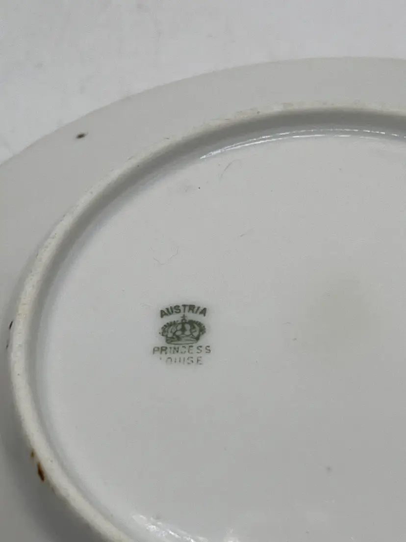 Vintage Princess Louise Condensed milk container with saucer, no lid. The cup is white with two gold handles and features a design of light blue flowers with black outlines, along with horizontal light blue lines and black outlines near the base. The saucer is white with a matching light blue and black outline design and a gold rim. It is likely the "Princess Louise" condensed milk tea set, based on the user's description and the distinctive design elements. These sets were popular in the early 20th century and are characterized by their unique shape and decorative style, often featuring floral motifs and geometric patterns. Condensed milk cups were specifically designed for serving condensed milk, which was a common ingredient in tea and coffee during that era. In EUC Measures about 5 1/2" high.