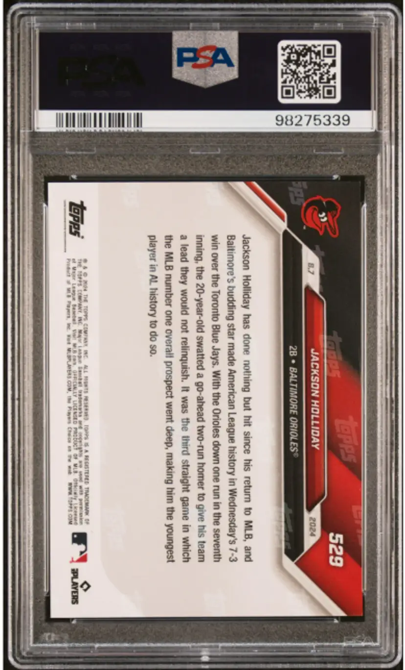 Gorgeous, PSA-graded 2024 Topps Now trading card of Jackson Holliday of the Baltimore Orioles. This is a PSA GEM-MT 10 (Gem Mint) collectible card. This card is protected within the PSA tamper resistant holder and is individually registered in an online searchable database provided by PSA. If we have multiples of the card listed, please note that the card pictured may be a sample image and a card of the exact grade advertised will be shipped to the buyer.