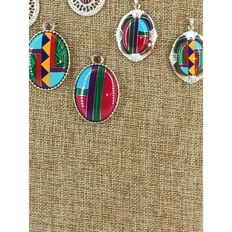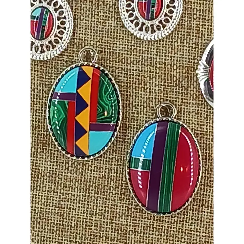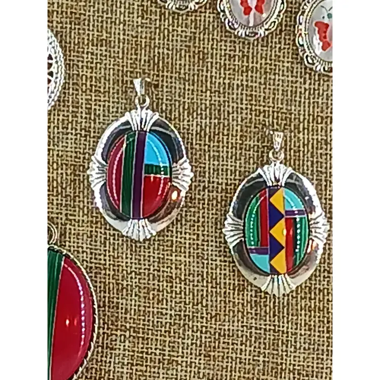 Qty 2 – Pendant with bail has mosaic of gemstone and silver cabochon that measures ¾ x 1 inch. This has have been mounted into a very shiny silver plated setting.