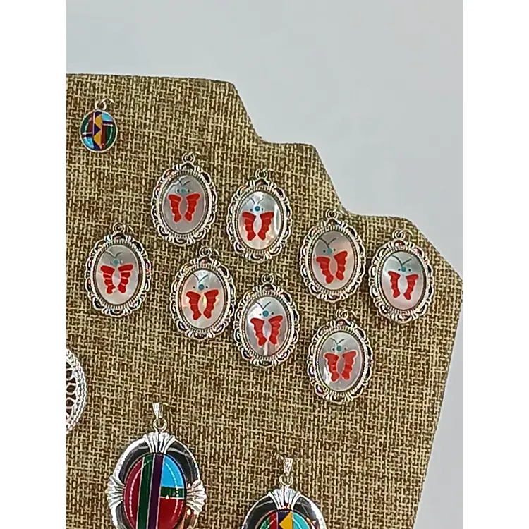 Qty 8 – Mosaic of Butterfly of Mother or Pearl and other gemstones. Cabochon measures ½ x ¾ inch and is mounted in a silver plated setting.