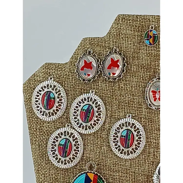 Qty 4 – Pendant with filigree edges and cabochon of gemstones and silver measures 3/8 x 5/8 inch