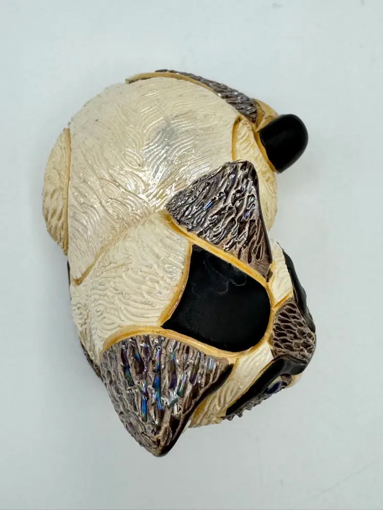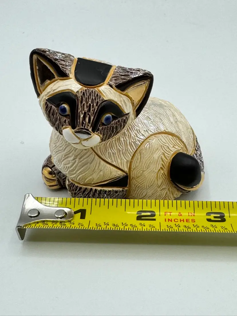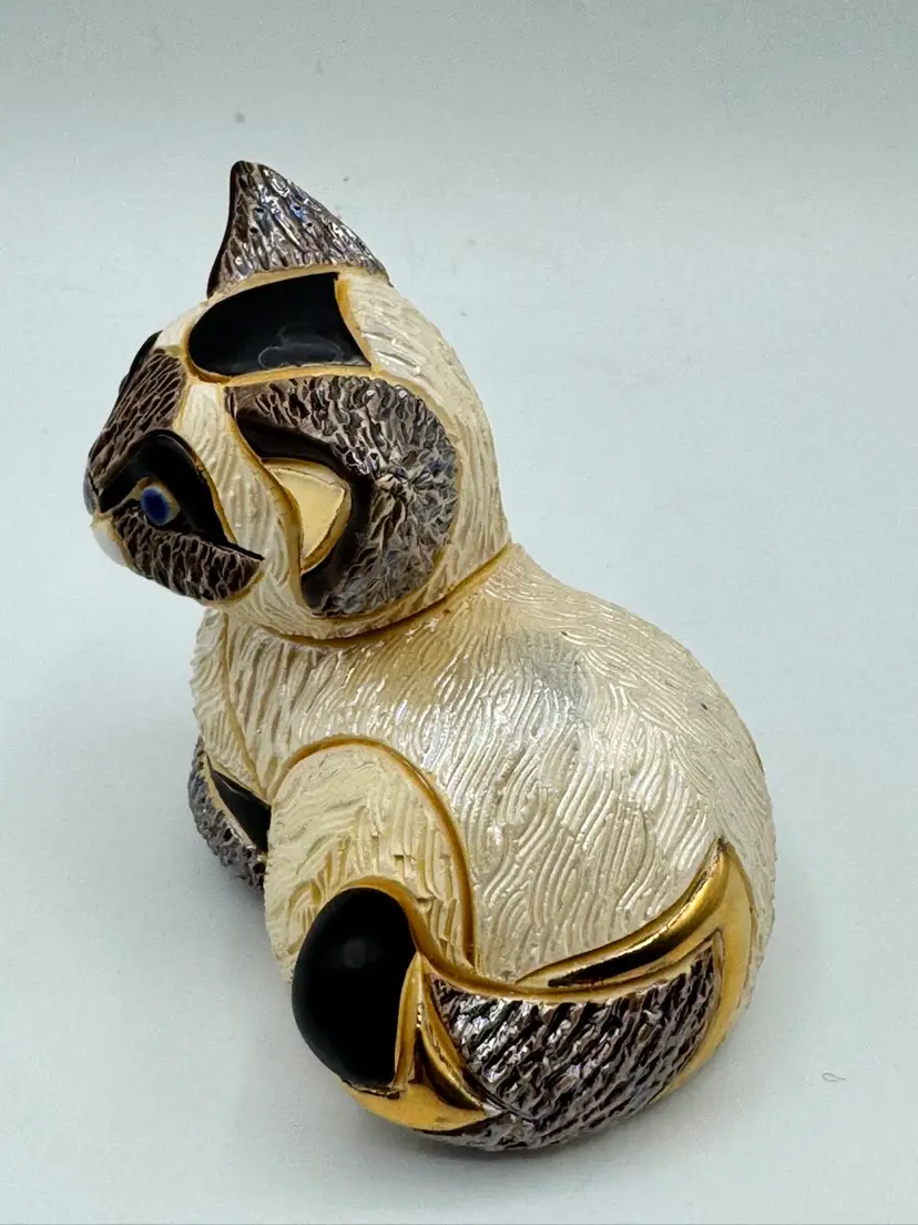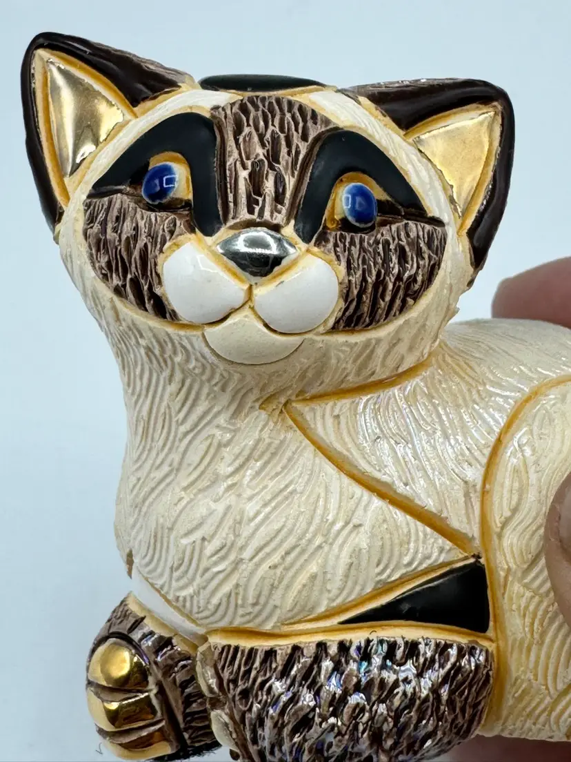 This finely crafted artisan sculpture is hand-carved and hand-painted in Uruguay, made by the renowned DeRosa Rinconada studio. The attention to detail is exceptional: textured fur carving, shimmering gold (18 karat) accents, rich enamel glazes, deeply blue sapphire-like eyes and accurate Siamese-style coloration.