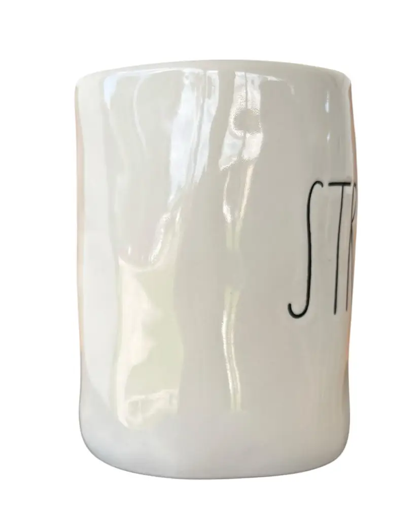 The Rae Dunn Mug "Strength" is a stylish and versatile white coffee tea mug cup featuring a solid color design with a roundish shape. Made from ceramic and porcelain, this medium-sized mug is perfect for both hot and cold beverages. It includes a handle for easy carrying and is ideal for all occasions. The modern design, featuring letters, numbers, and words, makes it a popular choice for unisex adults looking for a trendy and practical mug. This original Rae Dunn product is a must-have for anyone looking to add a touch of modern style to their kitchen or home decor.