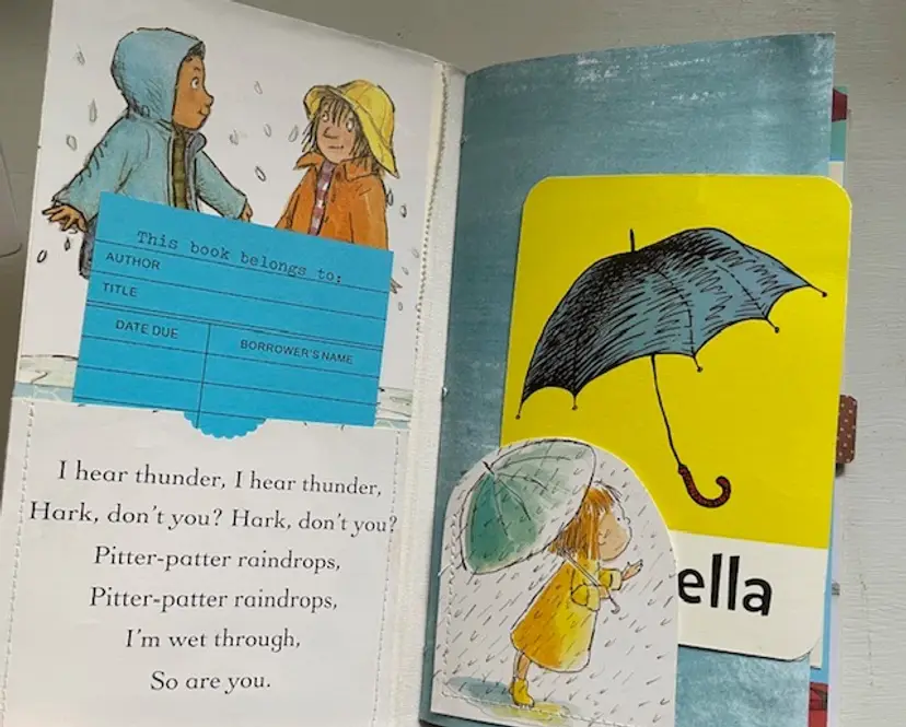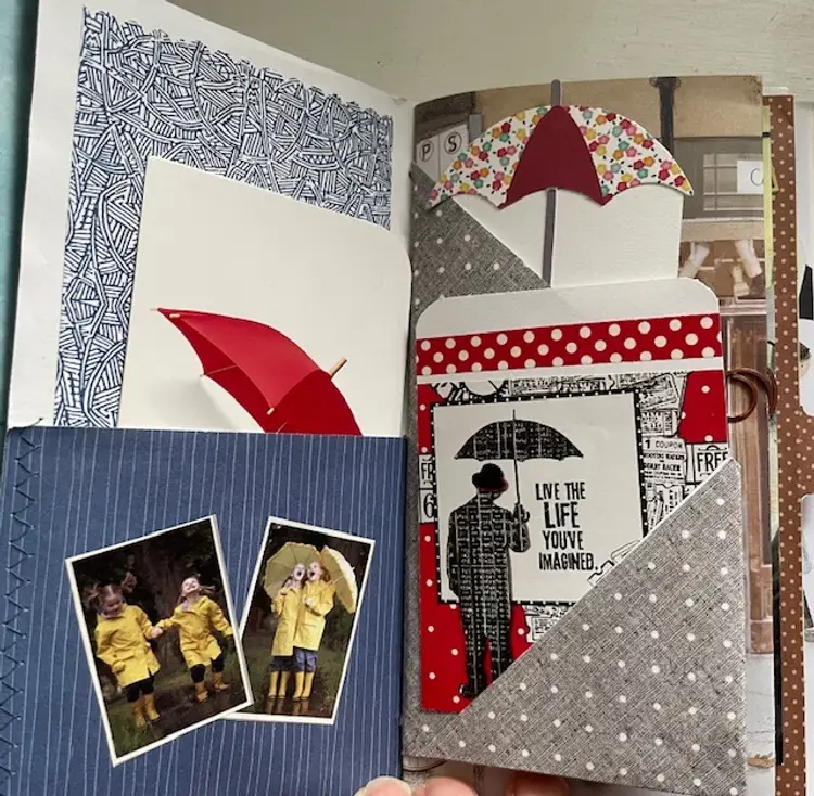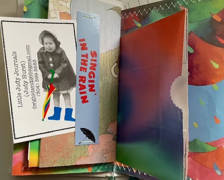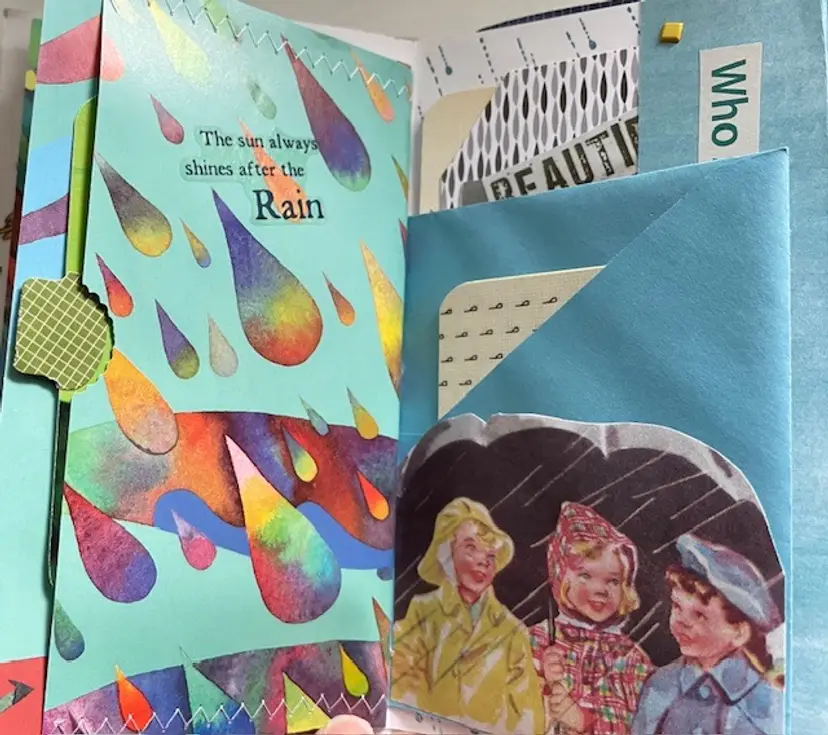 Although it is a rain theme, the bright colors will have you “singing in the rain.”There are 46 pages with plenty of pockets, tags, and belly bands. The cover is an authentic VHS tape box. Mostly original ephemera.