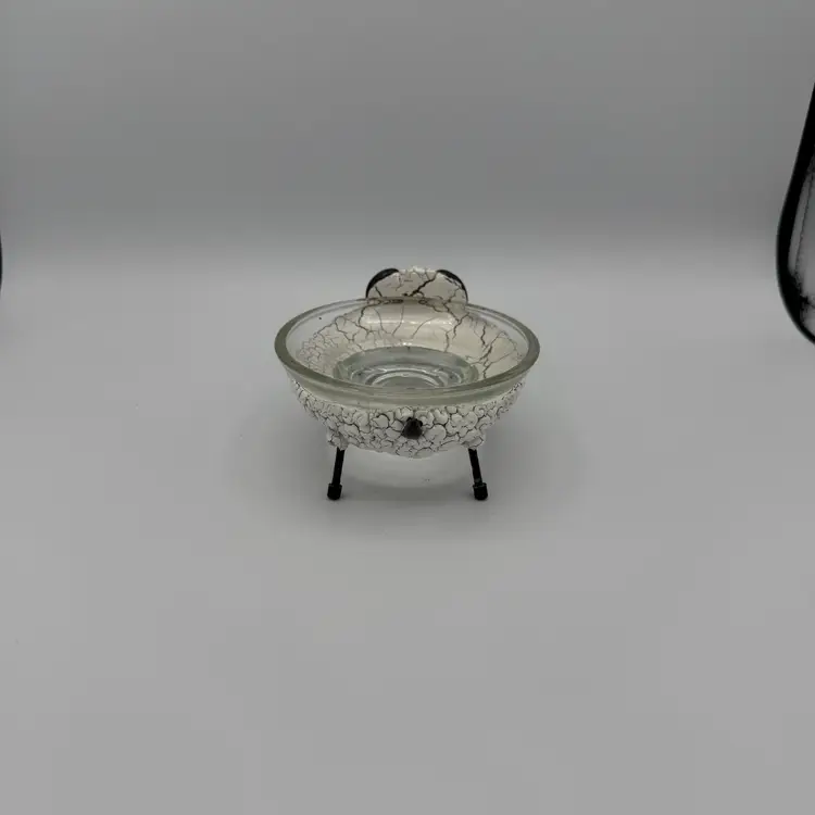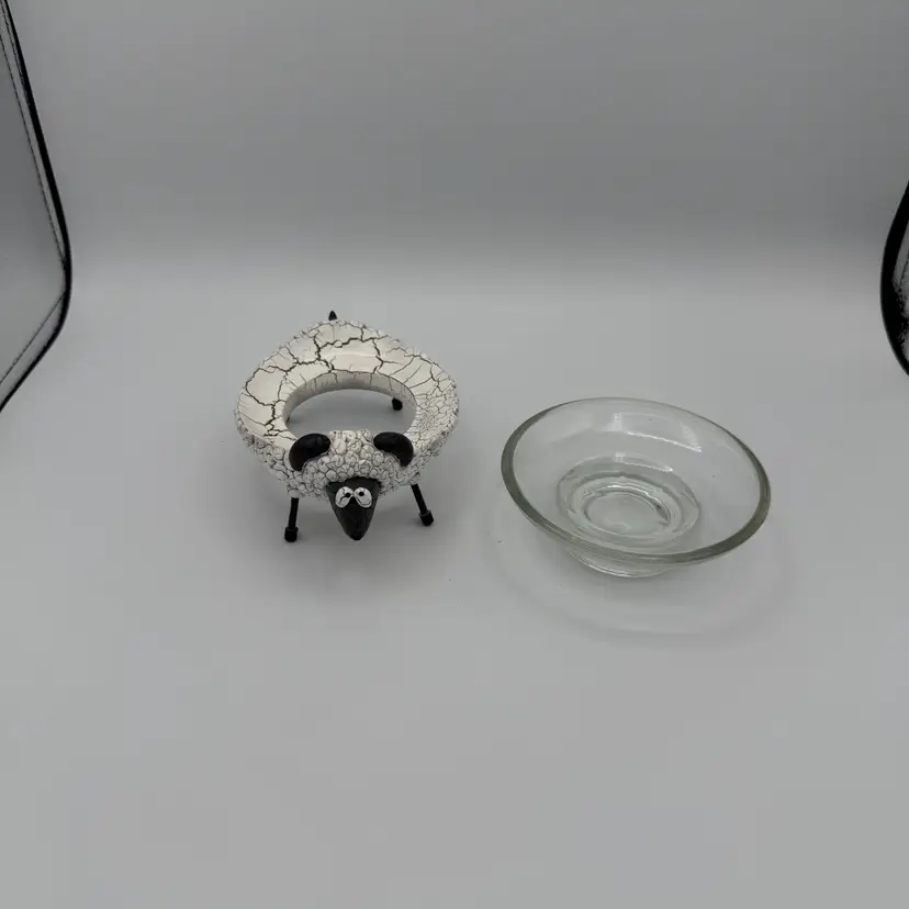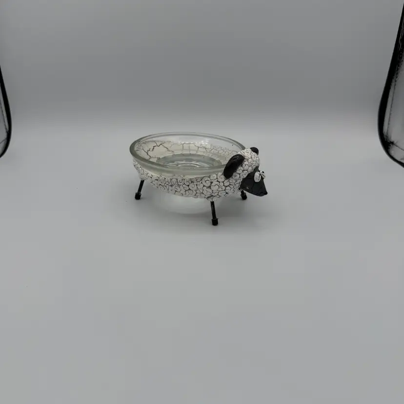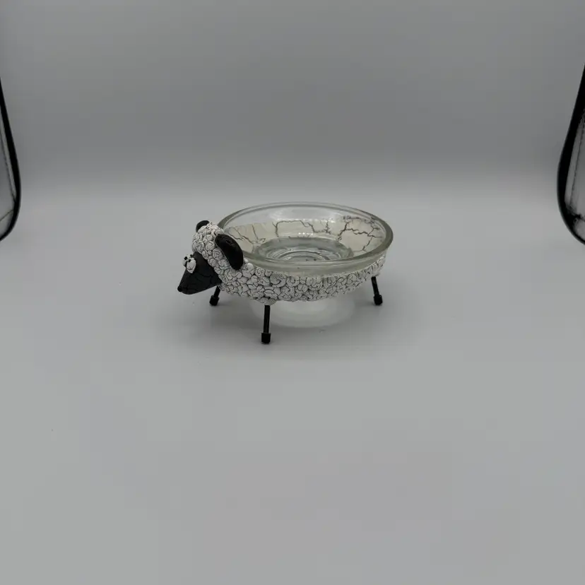 Raku Style Sheep White Pottery Standing With Glass Insert Trinket Dish. Perfect for jewelry. Removable Glass Insert. Overall 6" Wide.