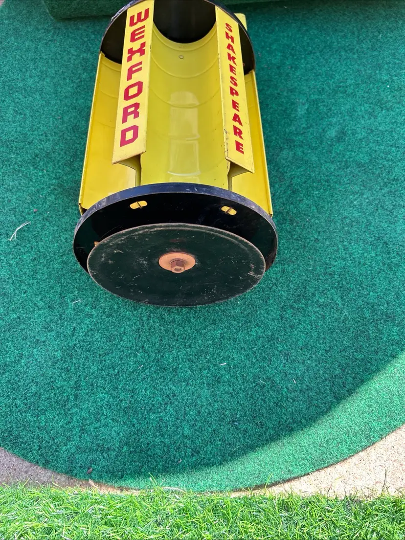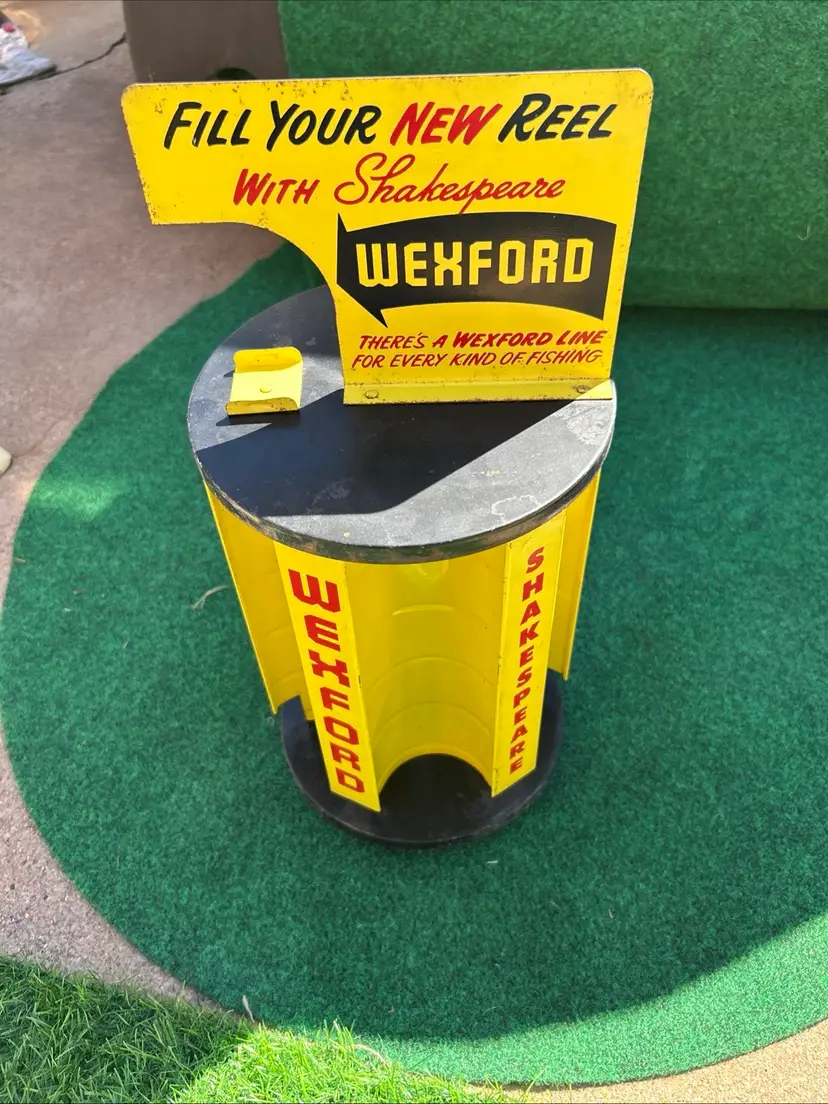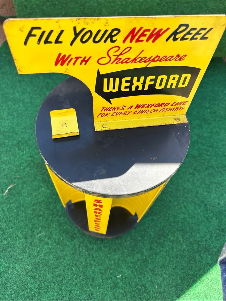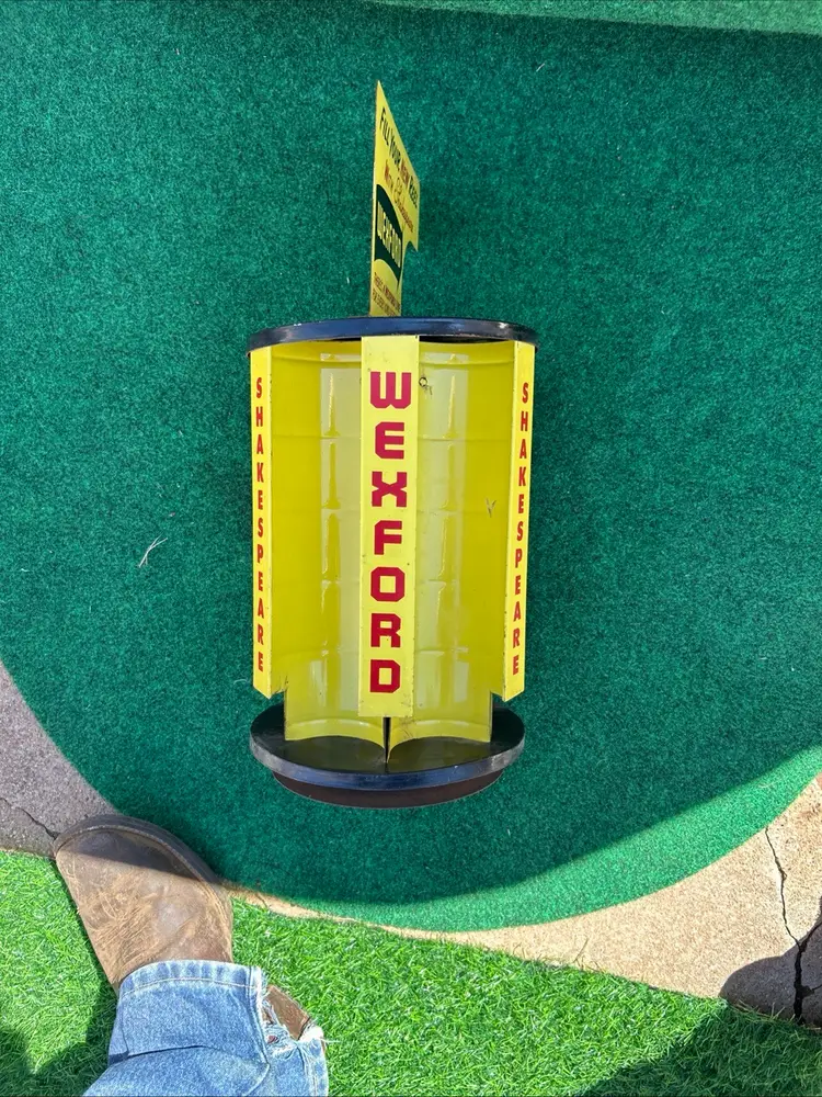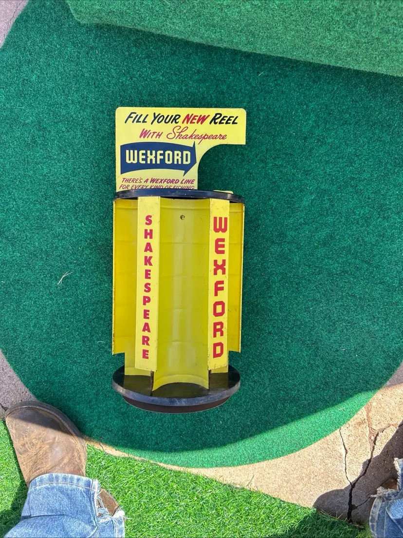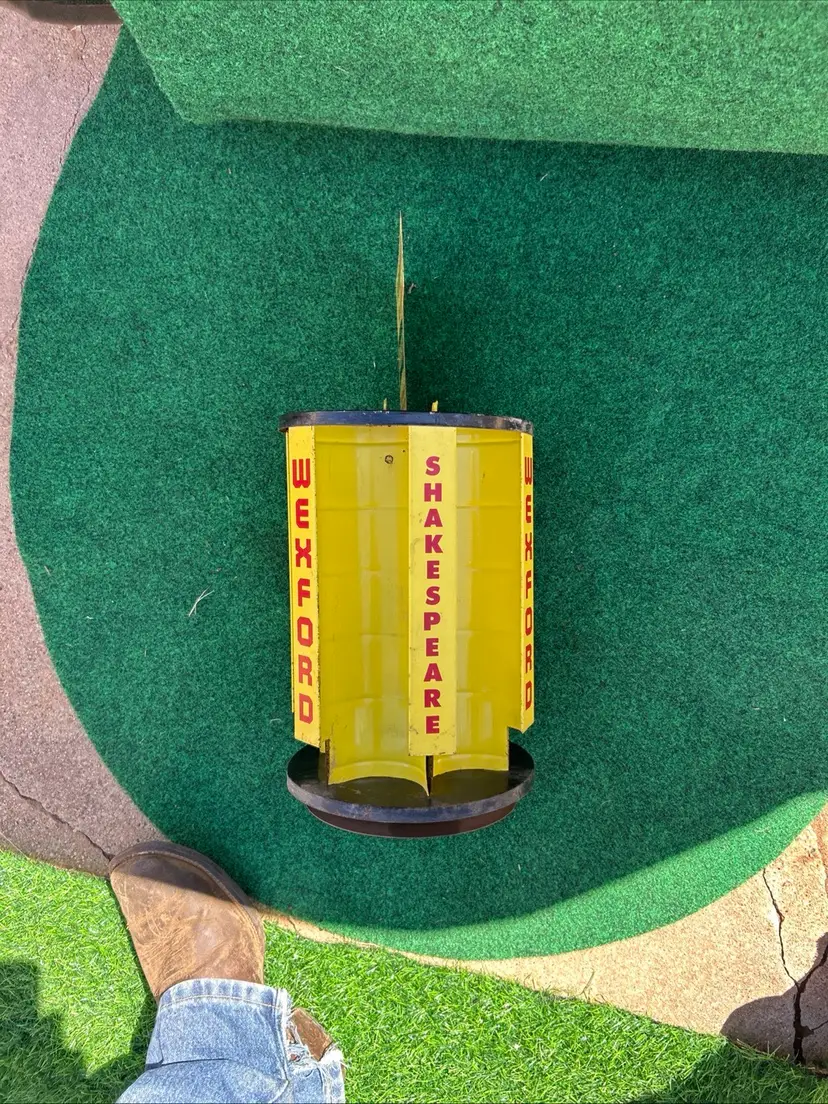 This product is a rare vintage display sign from Shakespeare, a well-known brand in the fishing industry. The sign features a yellow color and is related to freshwater fishing. Made in the United States, this unique item is a collector's piece for those interested in vintage fishing memorabilia.