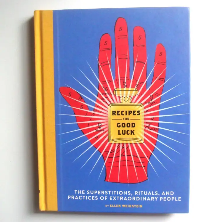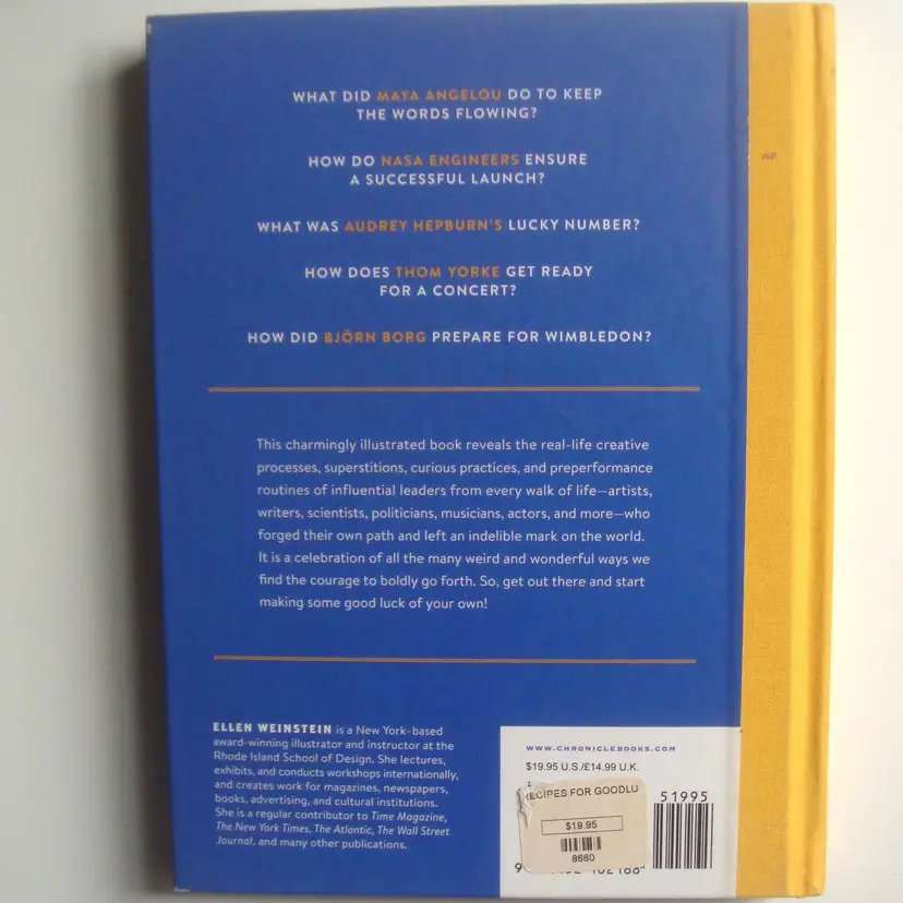 "from quirky superstitions to pre-performance rituals, this book bottles the singular recipes for success of leading creatives, politicians, scientists, and athletes who made their own luck." Artfully illustrated & silk-screened cloth spine Chronicle Books 2018 EUC, no marks/creases.