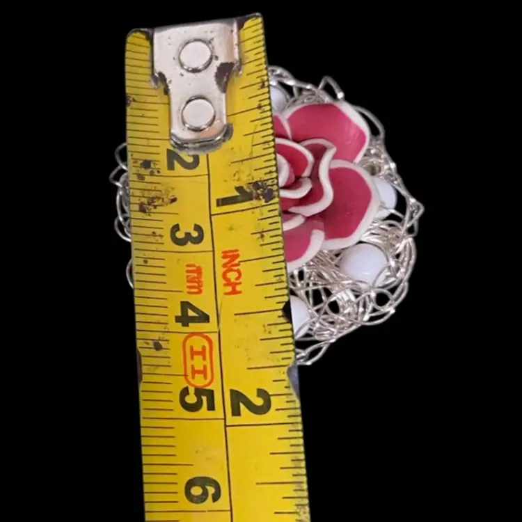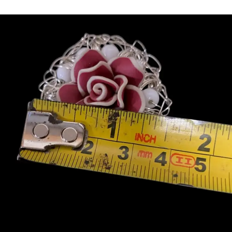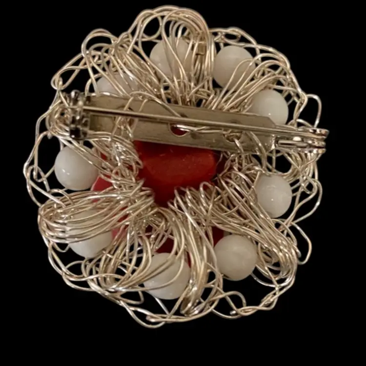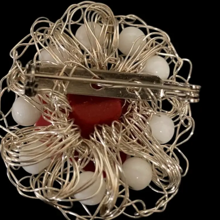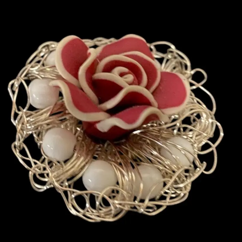 Vintage Brooch Red & White Rose With White Beads , Brooch