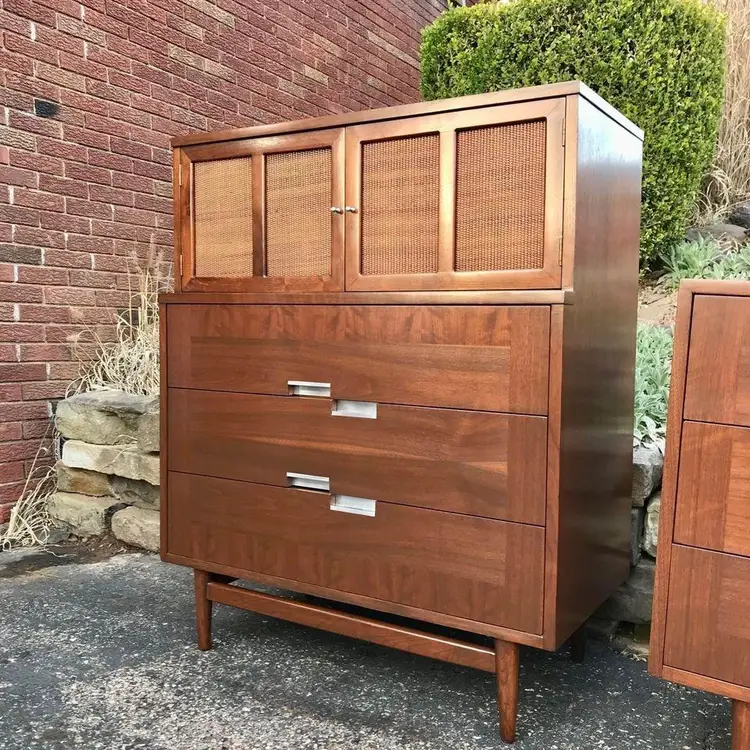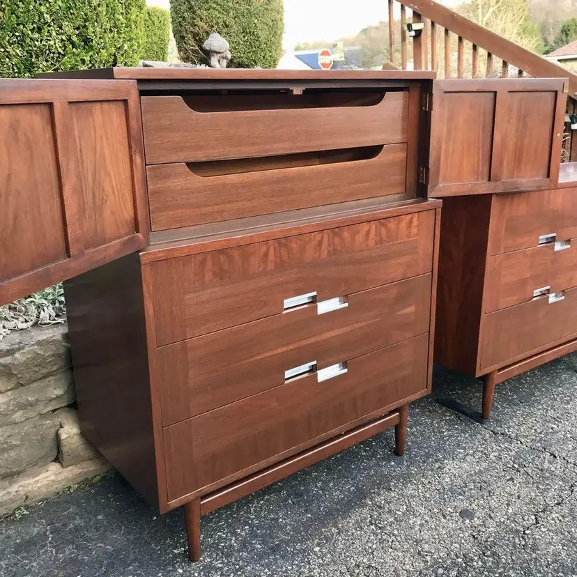 Beautifully and skillfully refinished from top-to-bottom this pair of walnut mid-century modern American of Martinsville dressers come from their “Accord” line. With their offset aluminum pulls and signature X insets on the tops they’re true stunners in any room. SHIPPING IS NOT INCLUDED. Can arrange shipping and provide an exact quote upon sale.