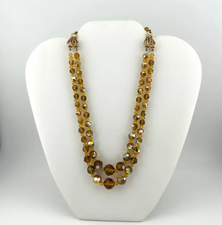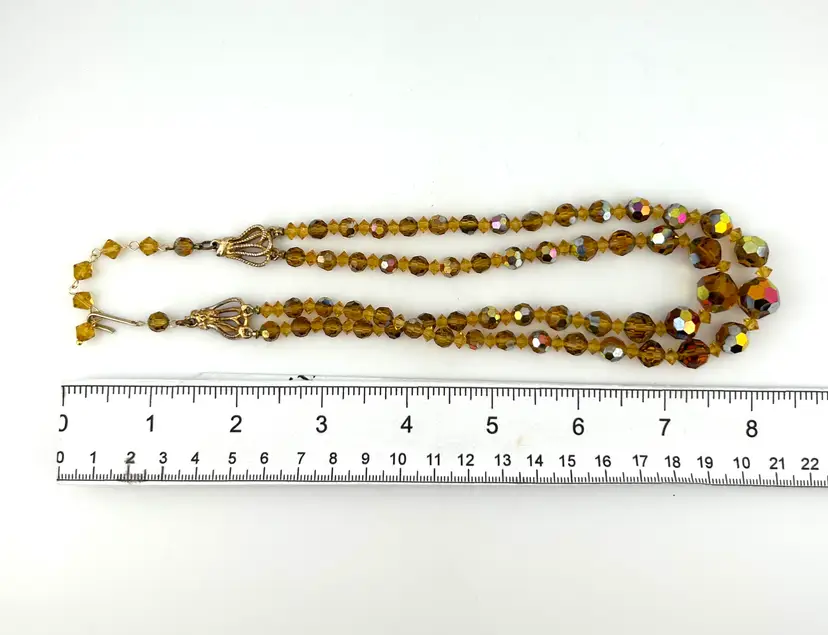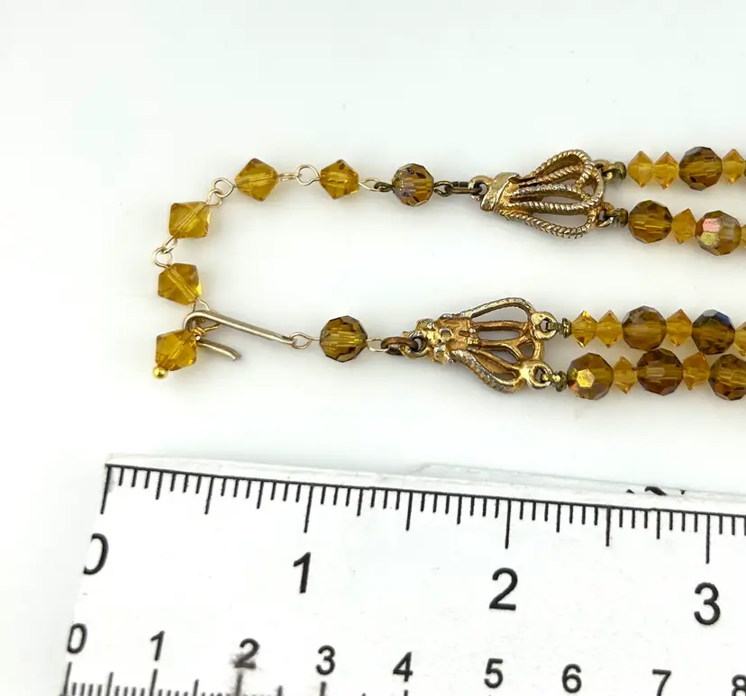 Necklace came to me with most of the extender chain missing. I used 5 vintage glass bicone beads to remake the extender chain so the necklace can be wearable.