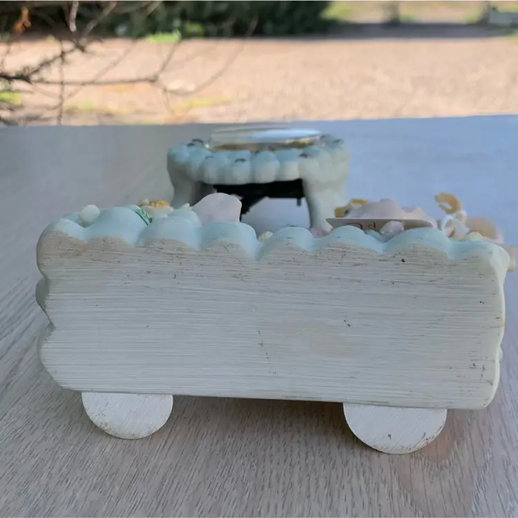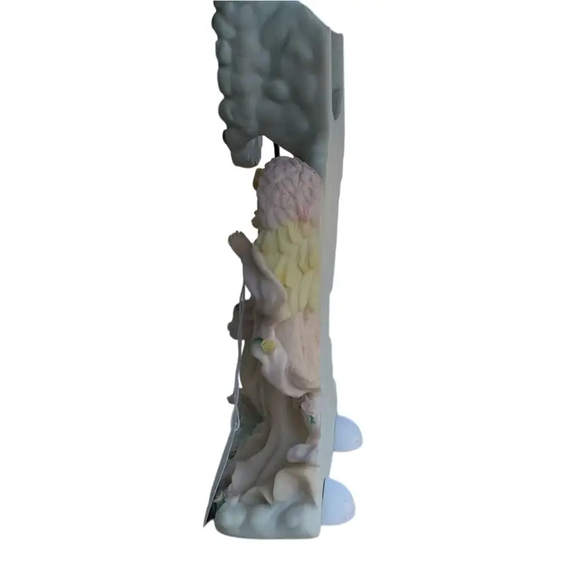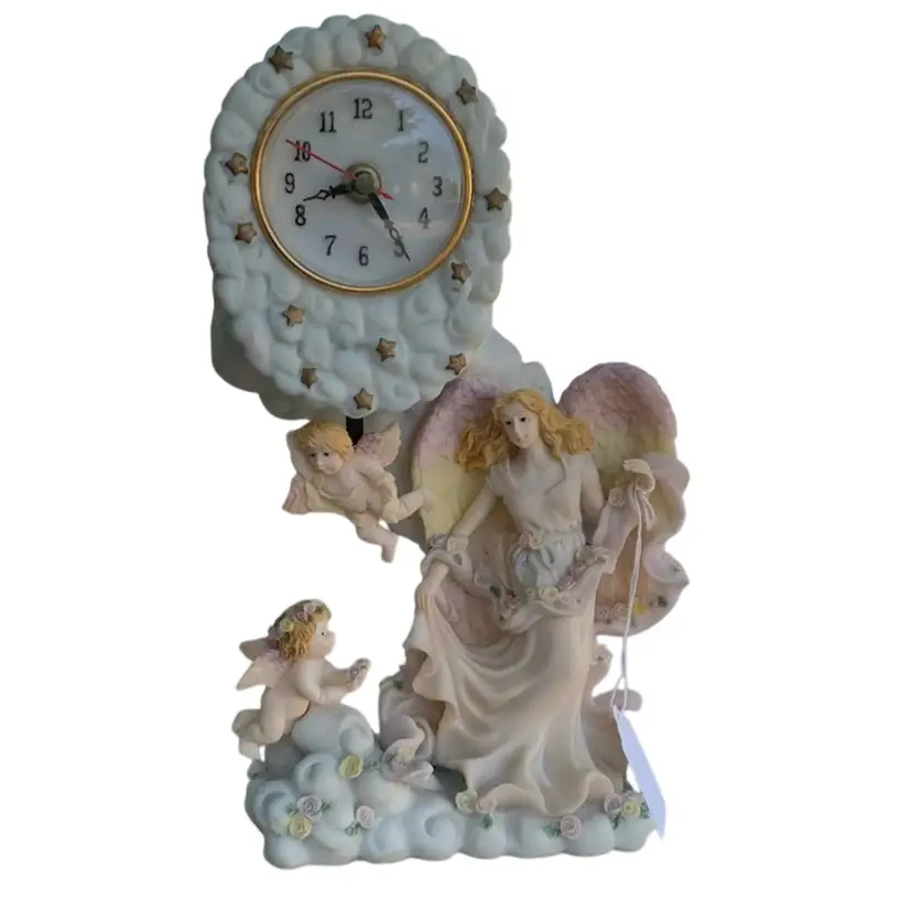 The pendulum works. So the little cherub moves left to right but the hand on clock do not move. It’s a beautiful decorative piece. 12” by 7” all flowers are intact