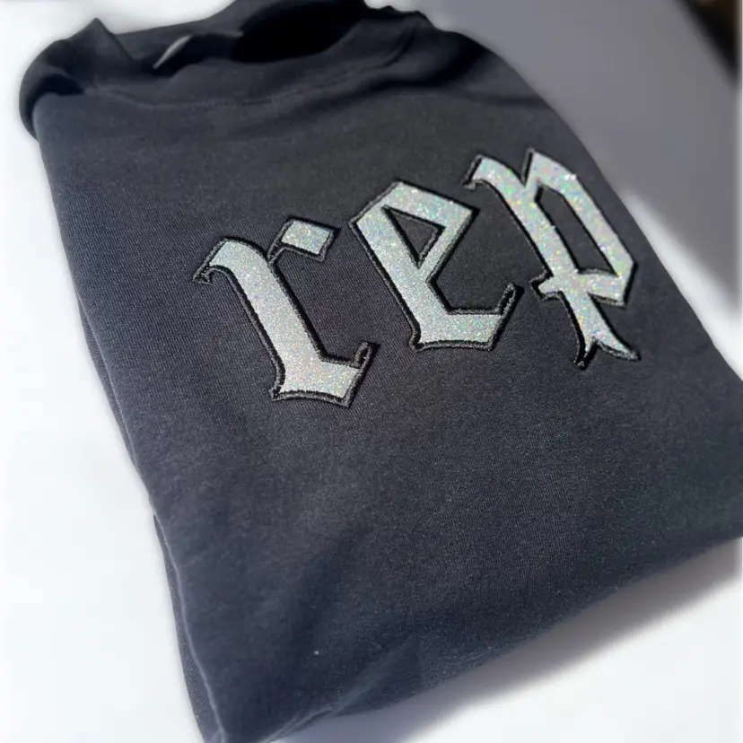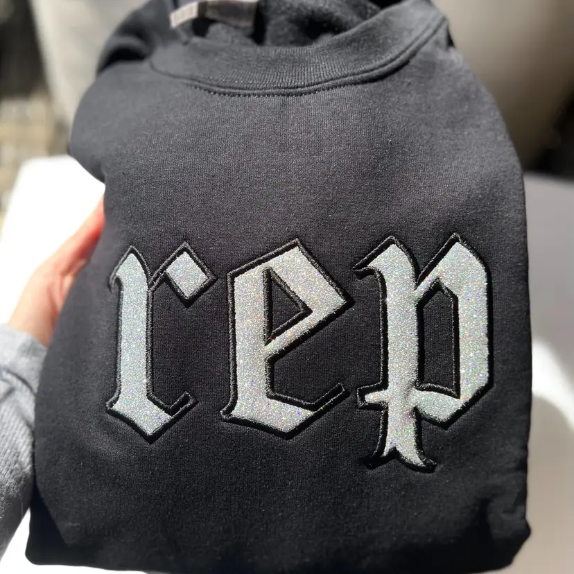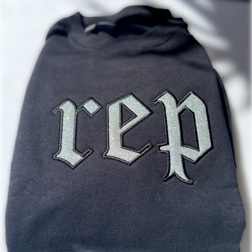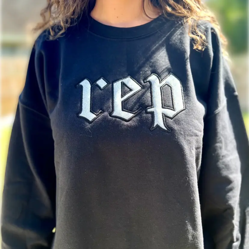 Introducing our black dazzling embroidered sweatshirt, featuring the iconic "Rep" logo inspired by Taylor Swift's groundbreaking album. this sweatshirt boasts a glitter appliqué that adds a touch of sparkle to your wardrobe. Embrace your love for reputation with this stylish and comfortable statement piece.