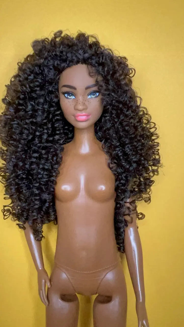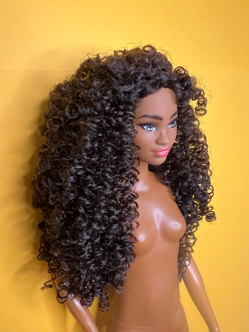 Rerooted with cute bouncy curls. Cute freckles on her face, nice brown skin, beautiful shaped eyes.