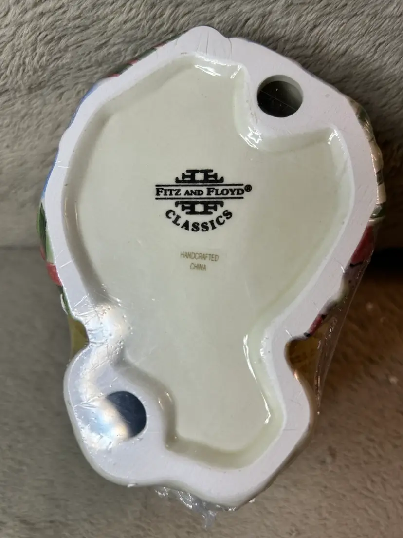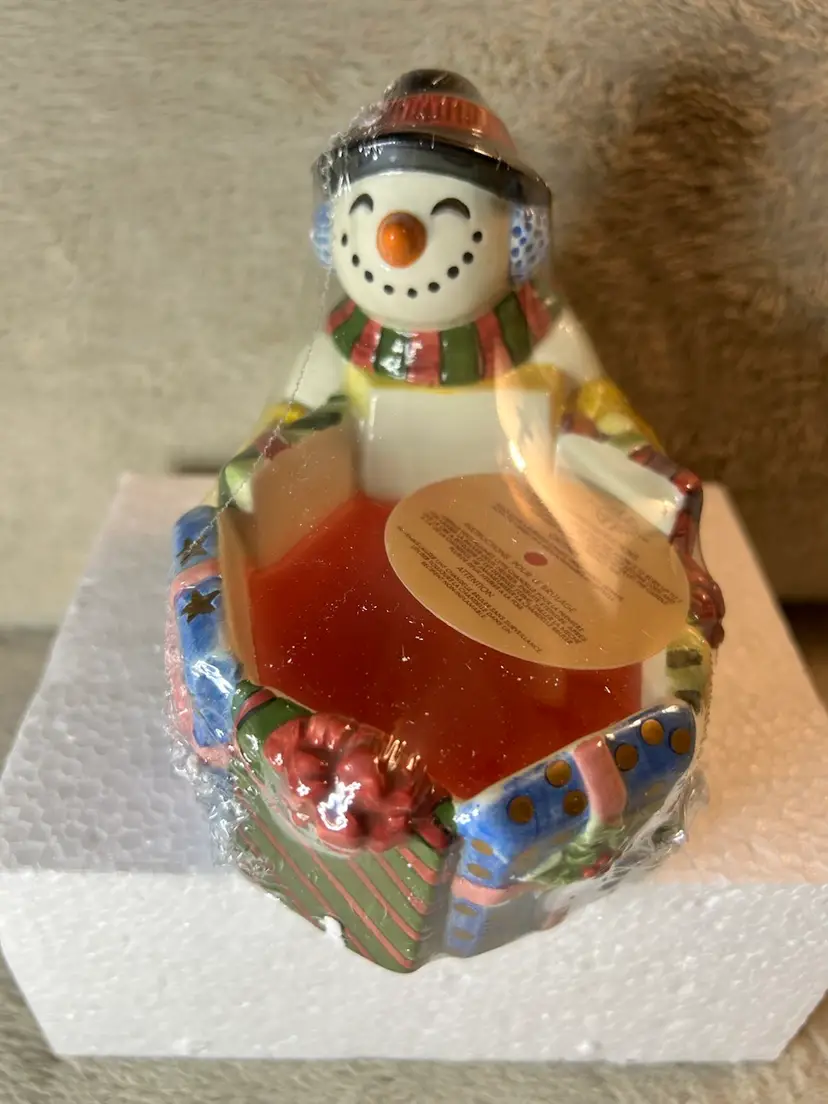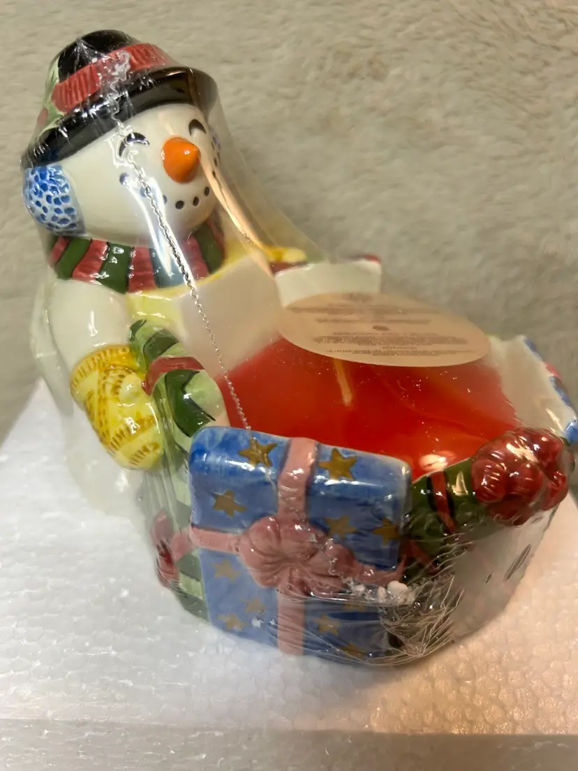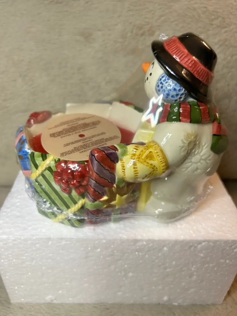 Fitz and Floyd Frosty Folks Candle Cup is a handcrafted ceramic candle holder. It features a snowman dressed in a hat, scarf, and earmuffs, holding a present, with space for a candle. The product was part of the "Frosty Folks" holiday collection.