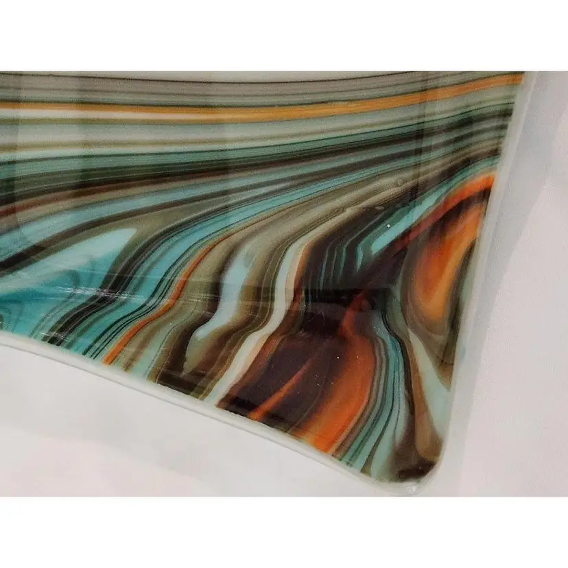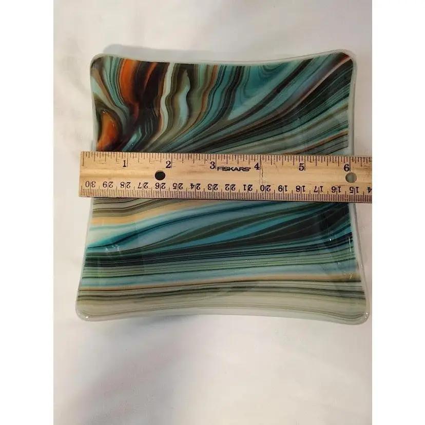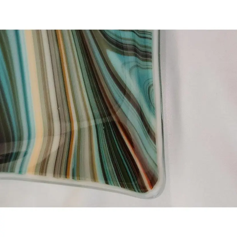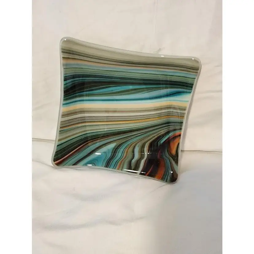 Add a splash of color to your decor with this retro swirled glass square plate. Its vibrant, flowing patterns make it a standout piece for any room. Perfect for serving or display!
