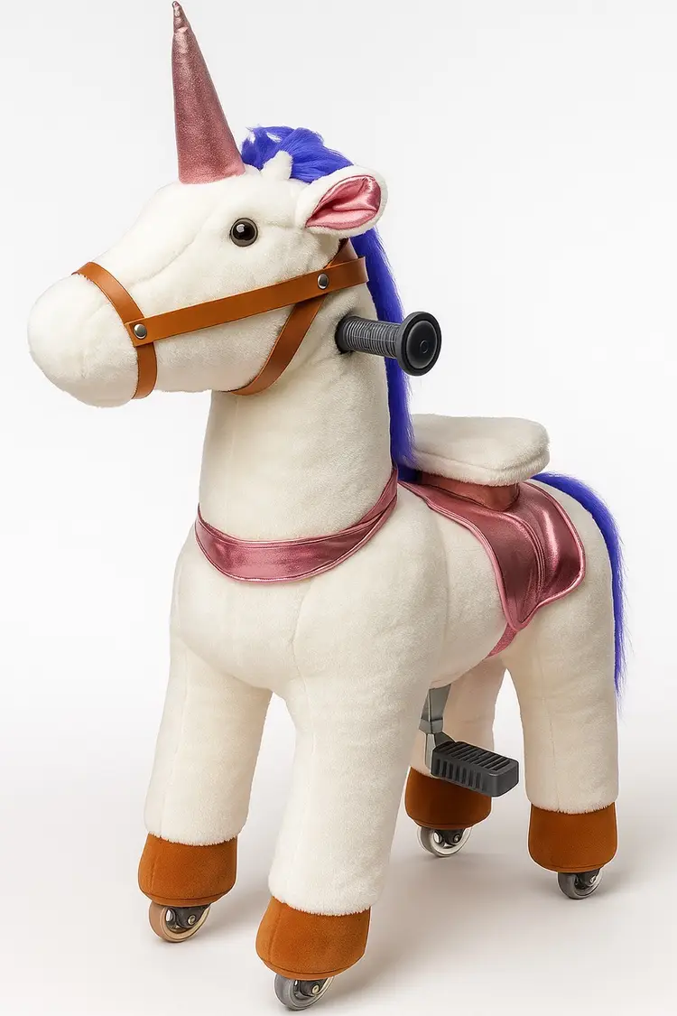 Description (Gen Z): This ain’t just a toy. This is a vibe on wheels. Ride-on plush unicorn with rainbow tail, pink saddle, and sturdy foot pedals. No batteries. No drama. Just push and roll like the majestic baddie you are.