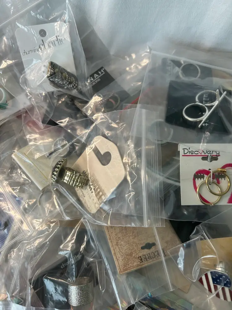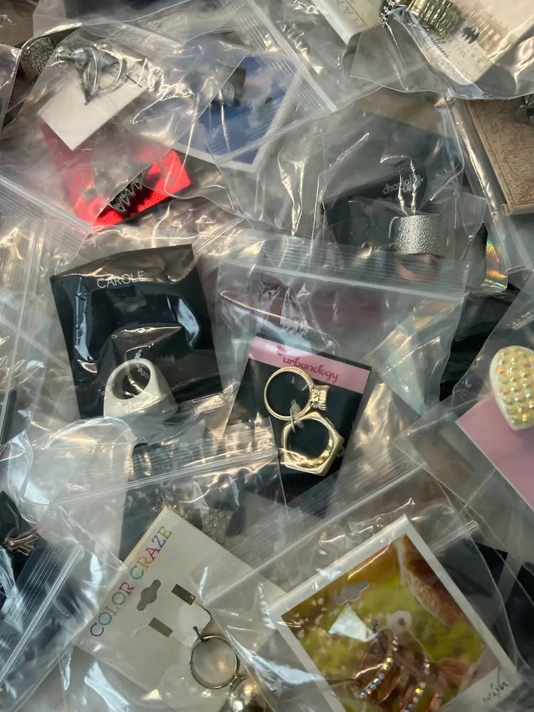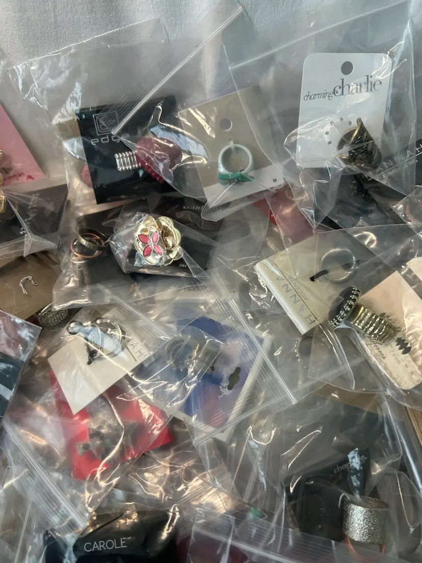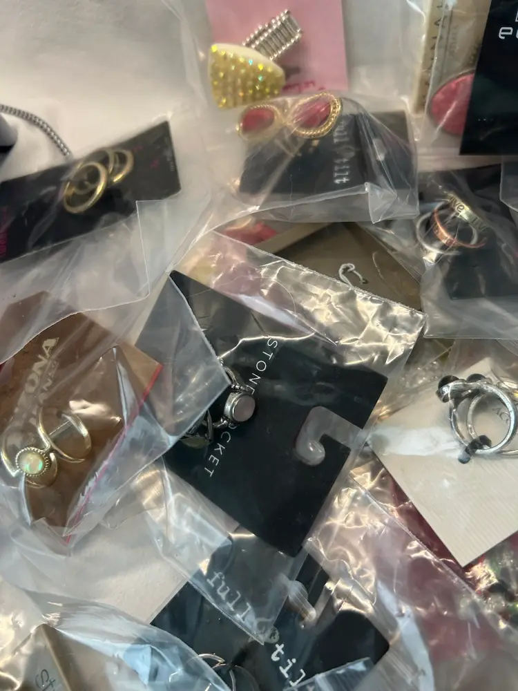 All brand new rings still on the cards different sizes different styles, different colors big variety