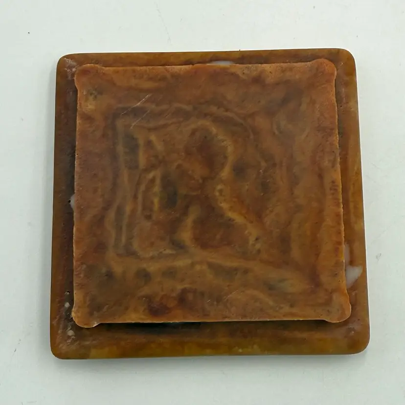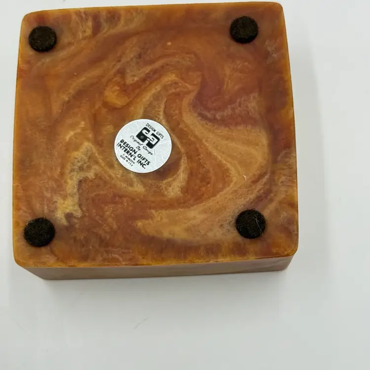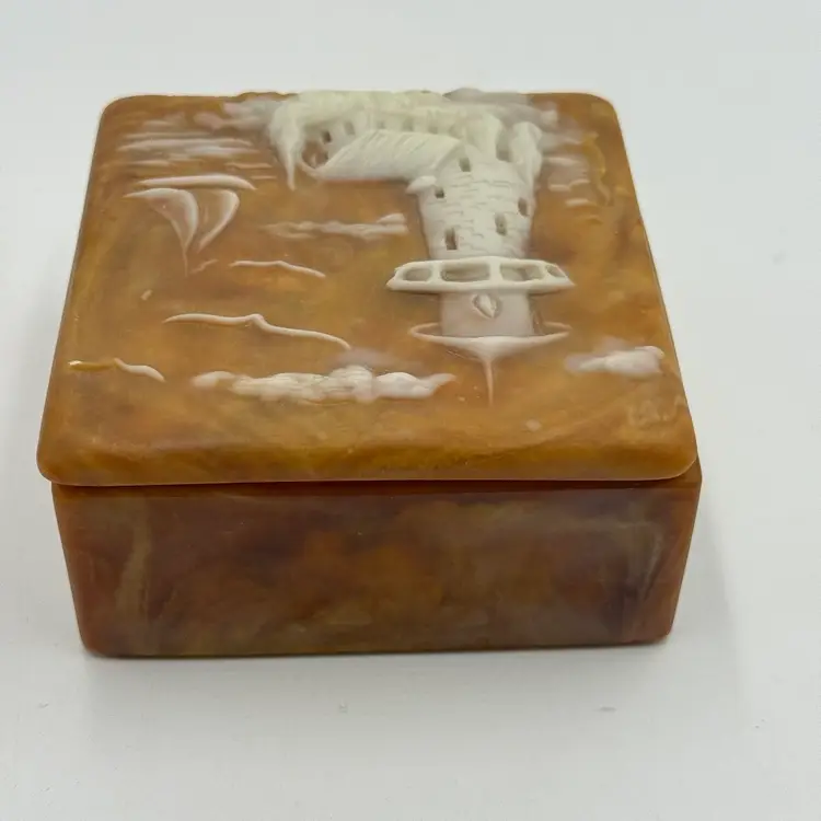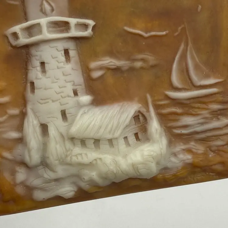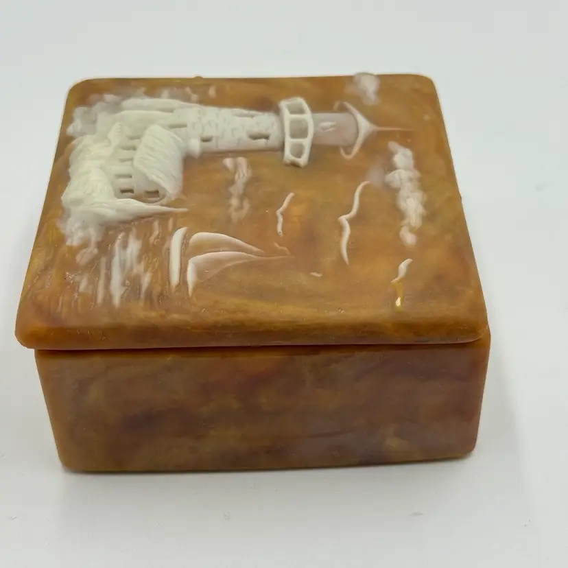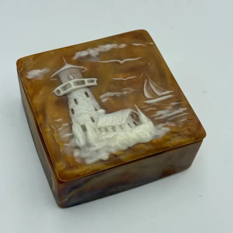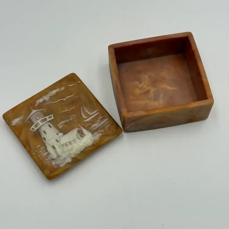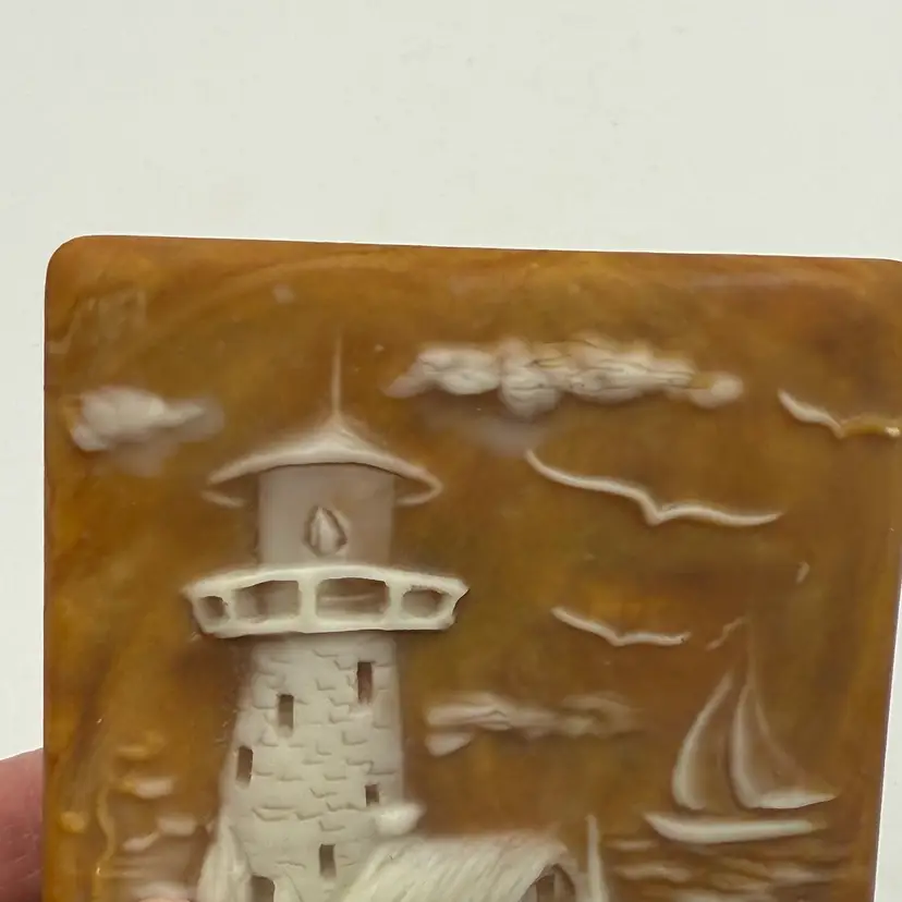 In good condition. There is a small chip on the top edge of the lighthouse. Measures 3 1/2 inches square and 1 3/4 inches tall.