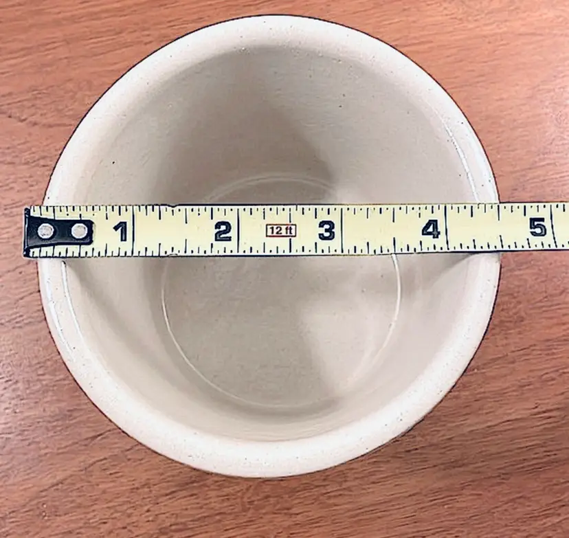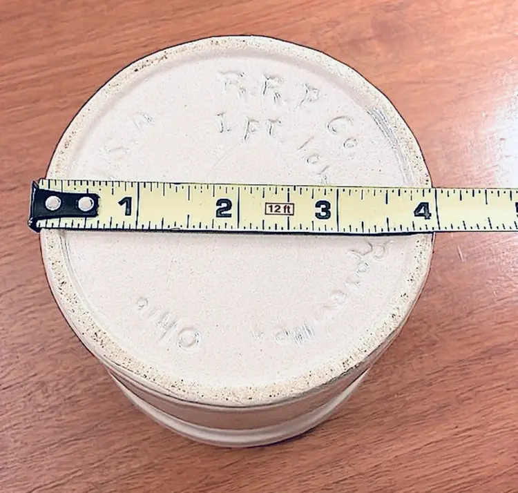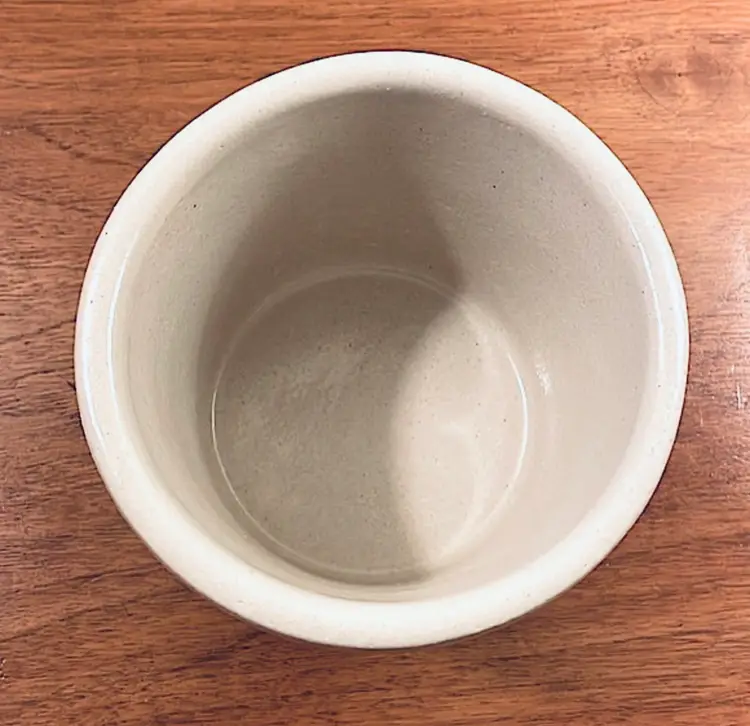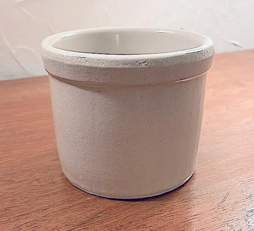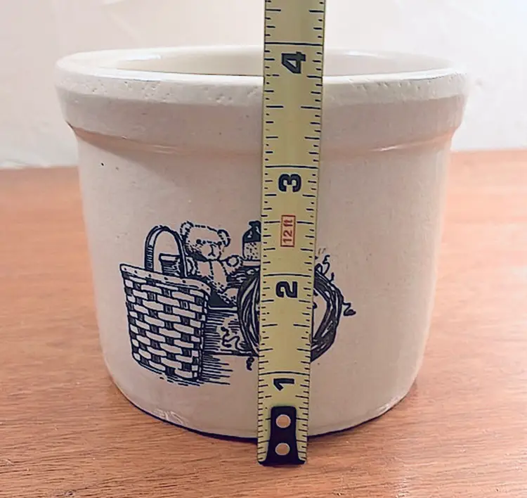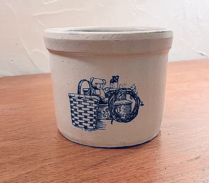 Robinson-Ransbottom, Roseville, OH, small grayish/cream colored crock with picture of basket, wreath, teddy bear in blue. Excellent condition and so sweet! Please see pictures for measurements.