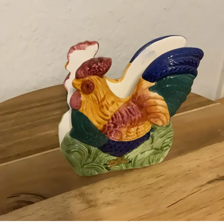 Bright and bold colors this rooster napkin holder would be a great addition to a farmhouse or country decor kitchen. 4.5” tall x 4” wide. Excellent condition with no chips or cracks.