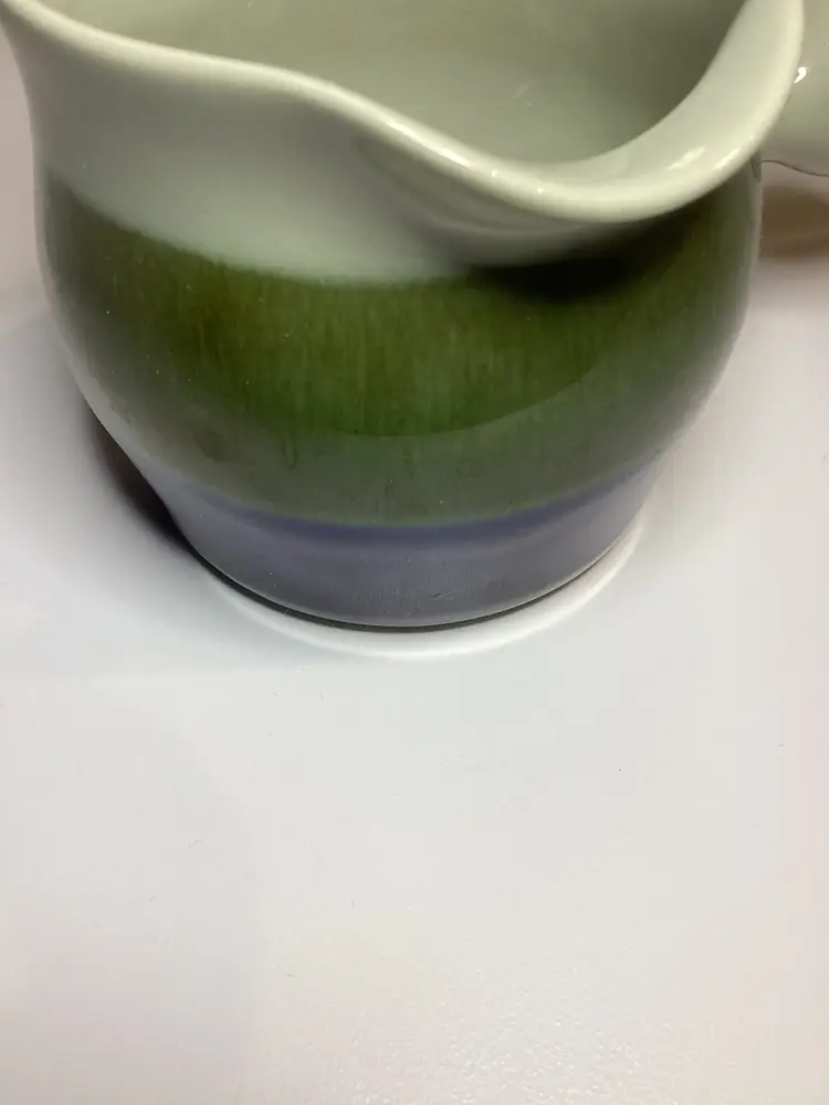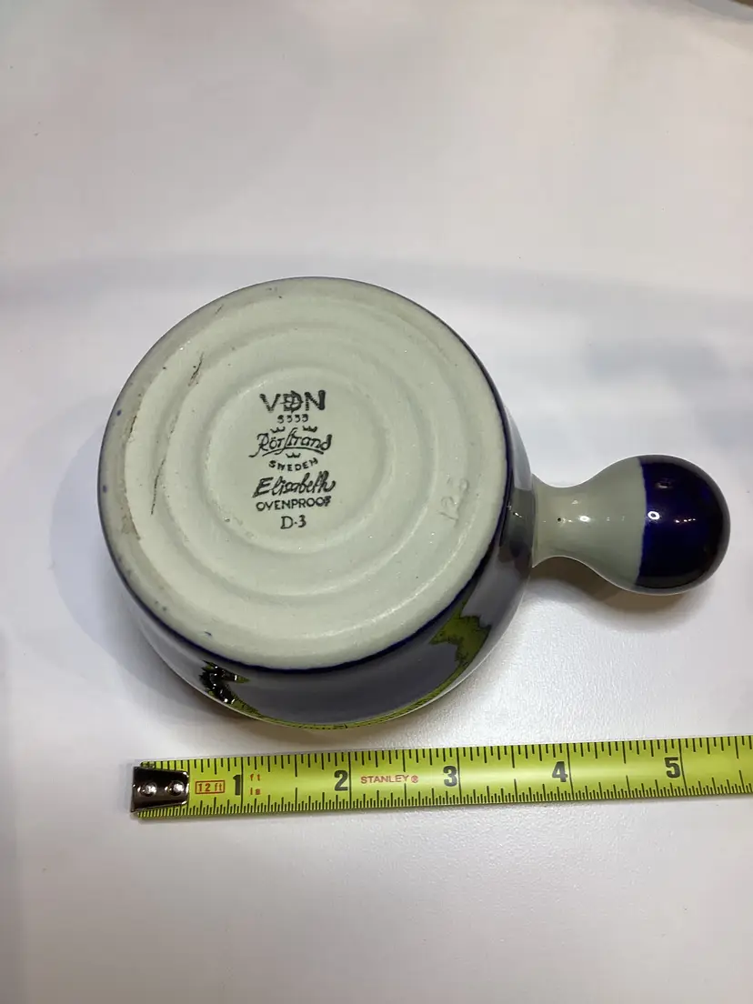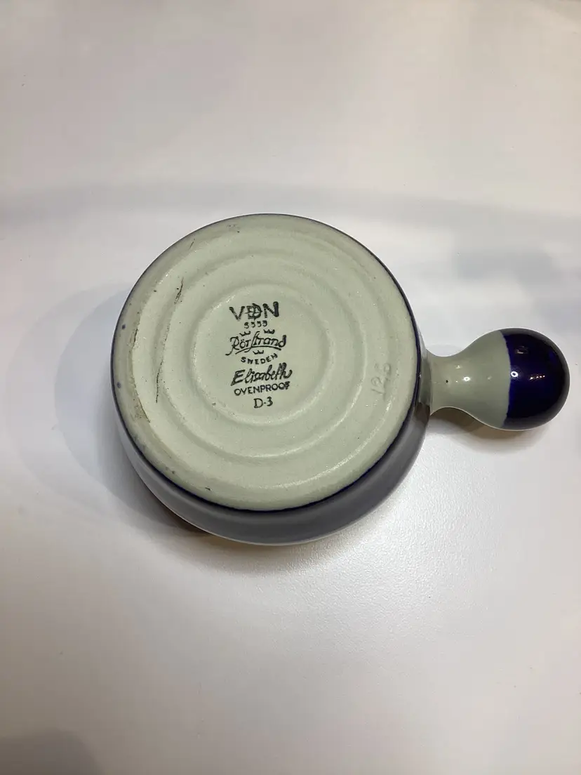 The Rorstrand Elisabeth creamer with knob handle is a vintage piece of pottery from Sweden. This creamer features a multicolor pattern and a glossy finish, typical of mid-century modern style. With a capacity of 8 ounces, this original and decorative piece is perfect for serving cream at the table. Its unique design and craftsmanship make it a stylish addition to any table setting, and it should be hand washed only to maintain its quality