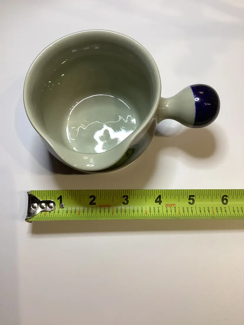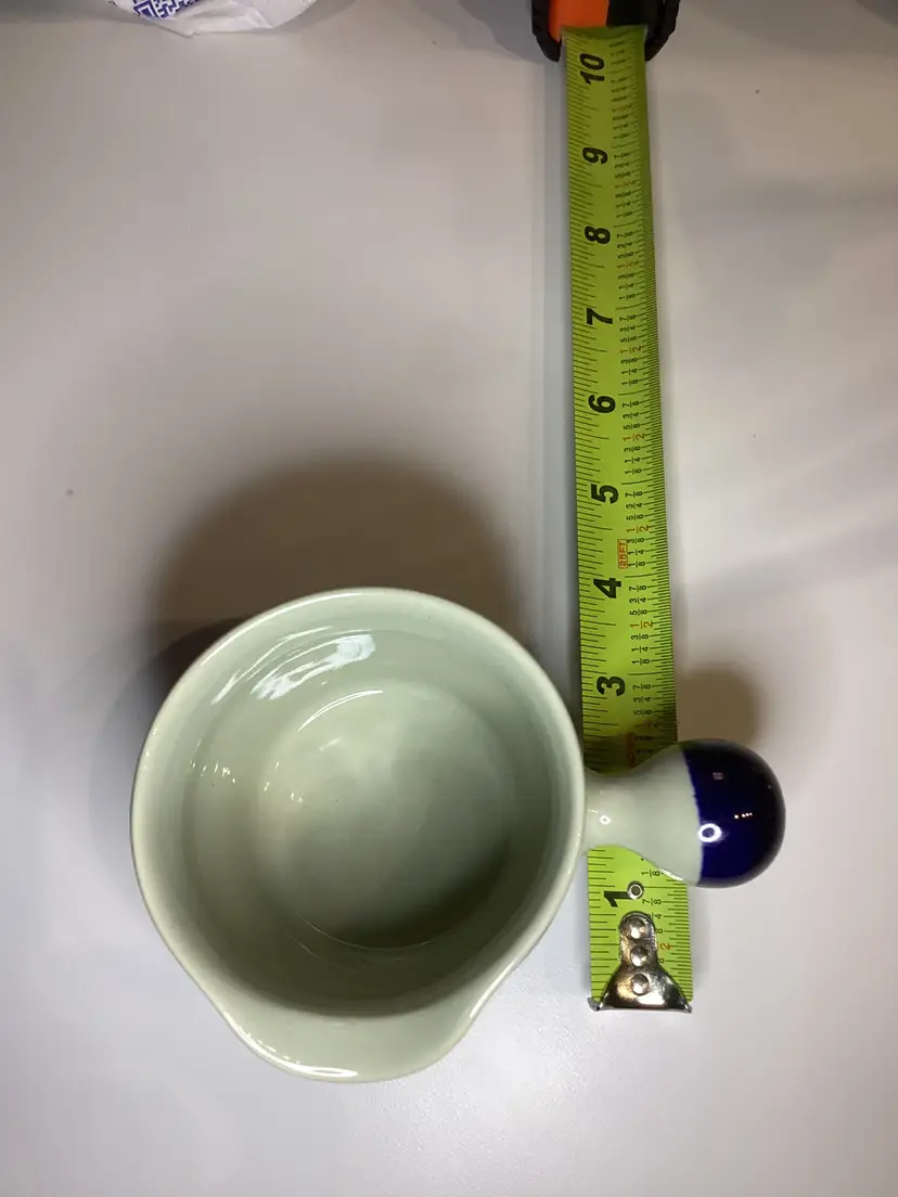 3” tall. I don’t see any chips. This item is gently used and may show minor wear. I listed stonewear as the material, however I did not make this item so I am not sure exactly what it is made out of.