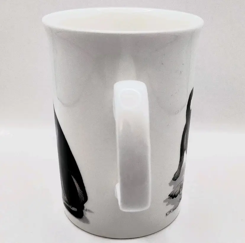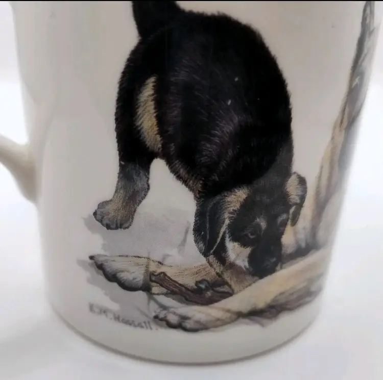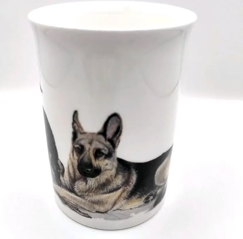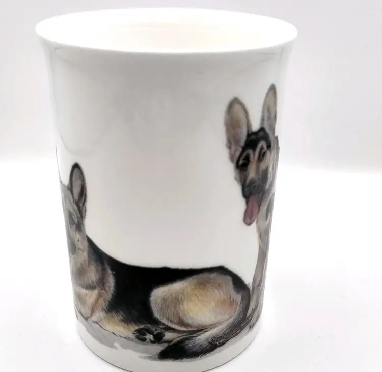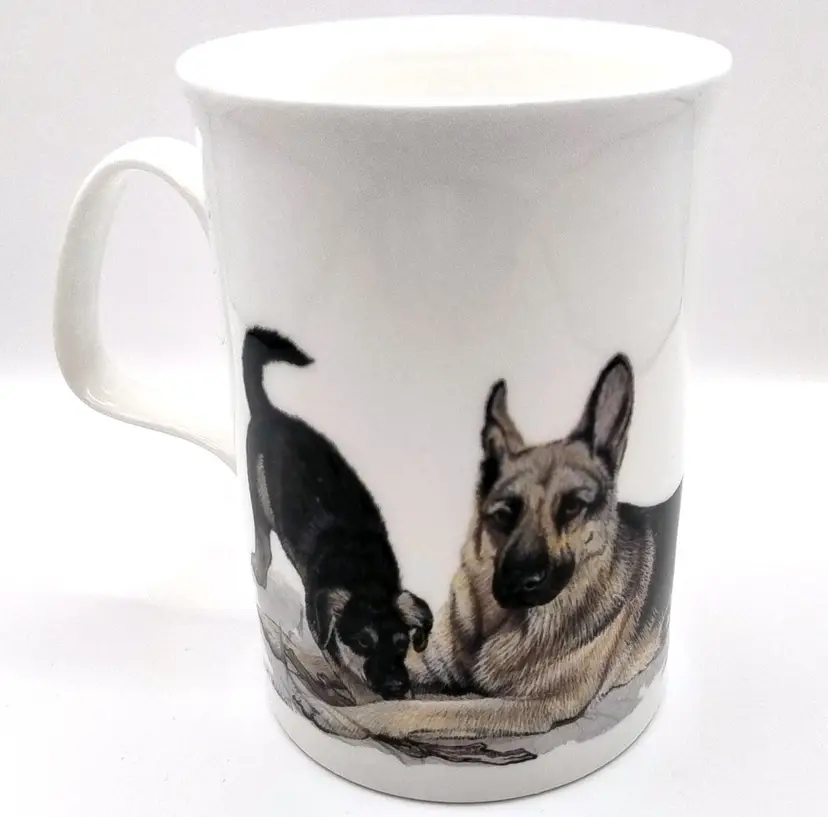 The Roy Kirkham Mug for dog lovers features a charming design of German Shepards and Alsatians. Made of fine bone china, this mug adds a touch of elegance to your home décor. Ideal for a canine lover's collection, this mug is a unique and stylish way to enjoy your favorite hot beverage while showing off your love for these adorable dogs.