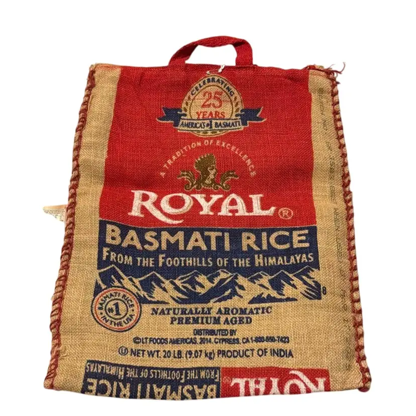 Handmade Royal Basmati Rice Tote bag. It was made from a 20lb bag of rice. handles and zipper were added.