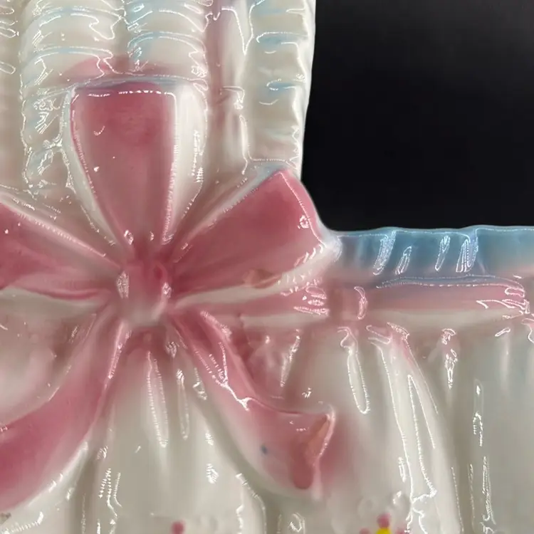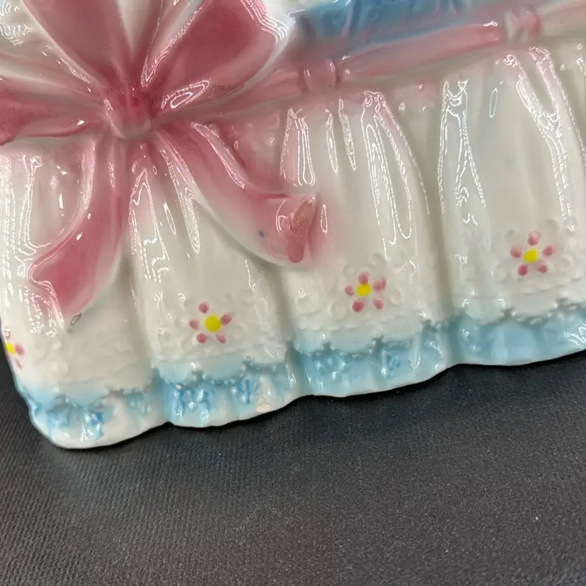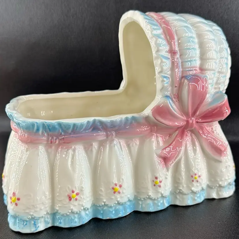 A couple small chips. Great filled with gifts for baby shower. Approximately 6 1/2” tall and 7 1/2” wide.