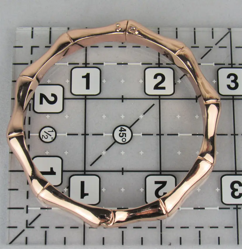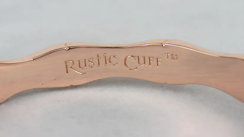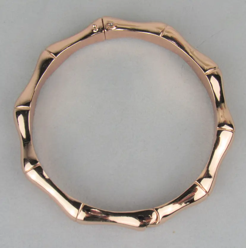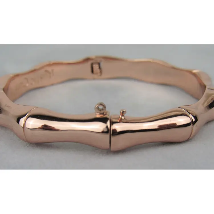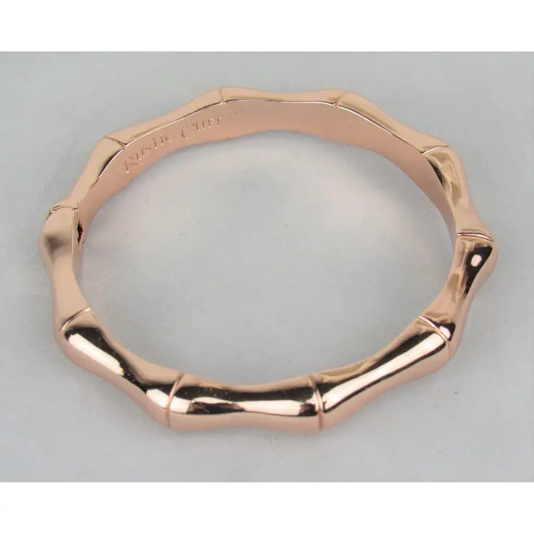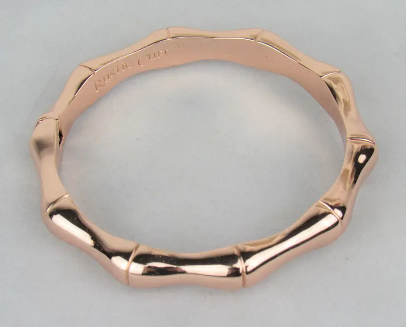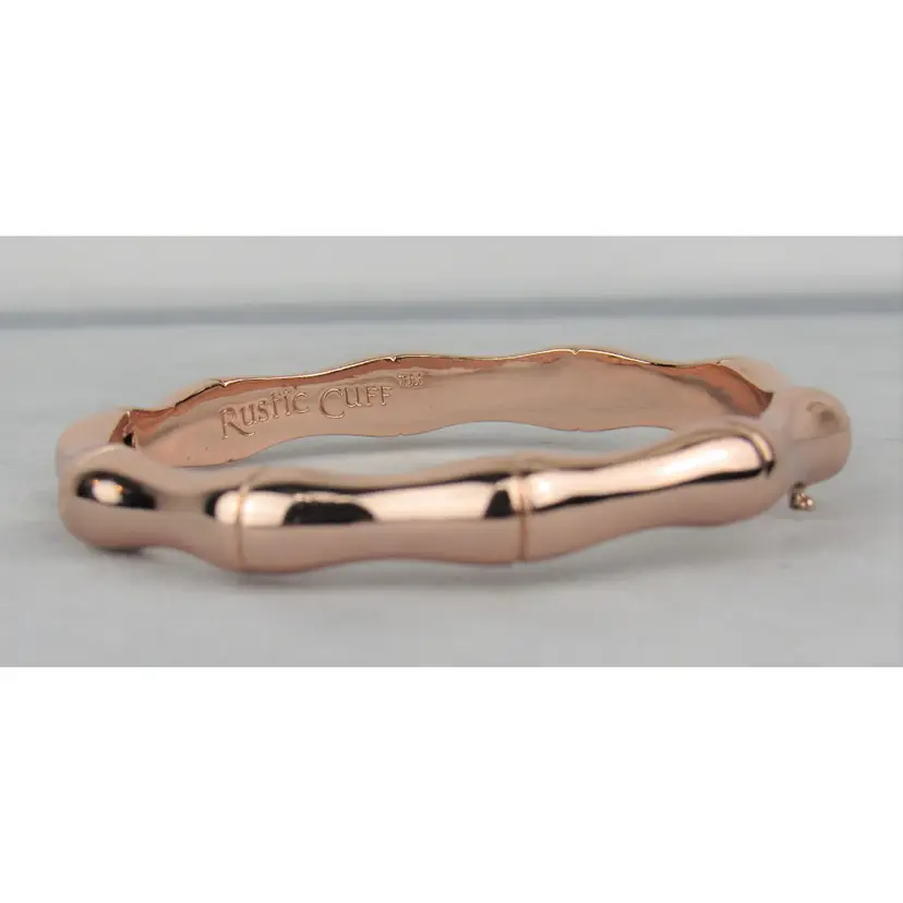 Rose Gold tone bracelet with magnetic closure. Missing the safety latch but the magnets are super strong and it is not coming open easily. Signed Rustic Cuff. Beautiful bamboo styling. Weighs 57.62 grams.