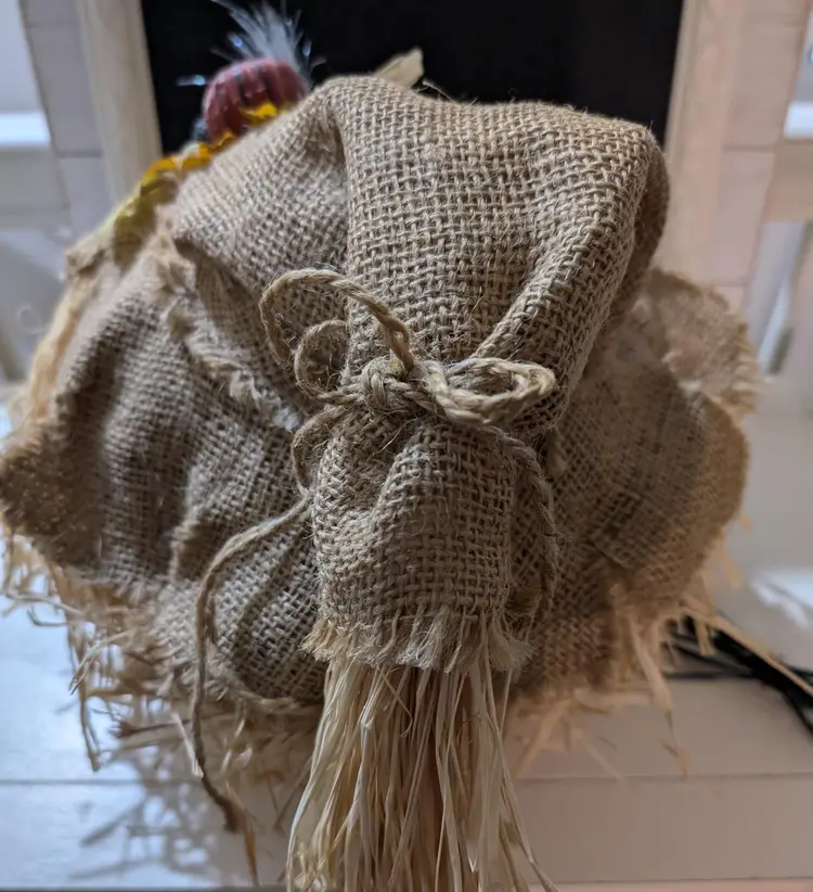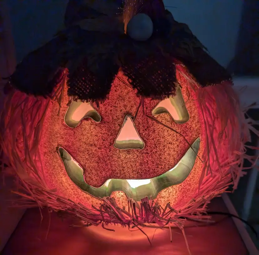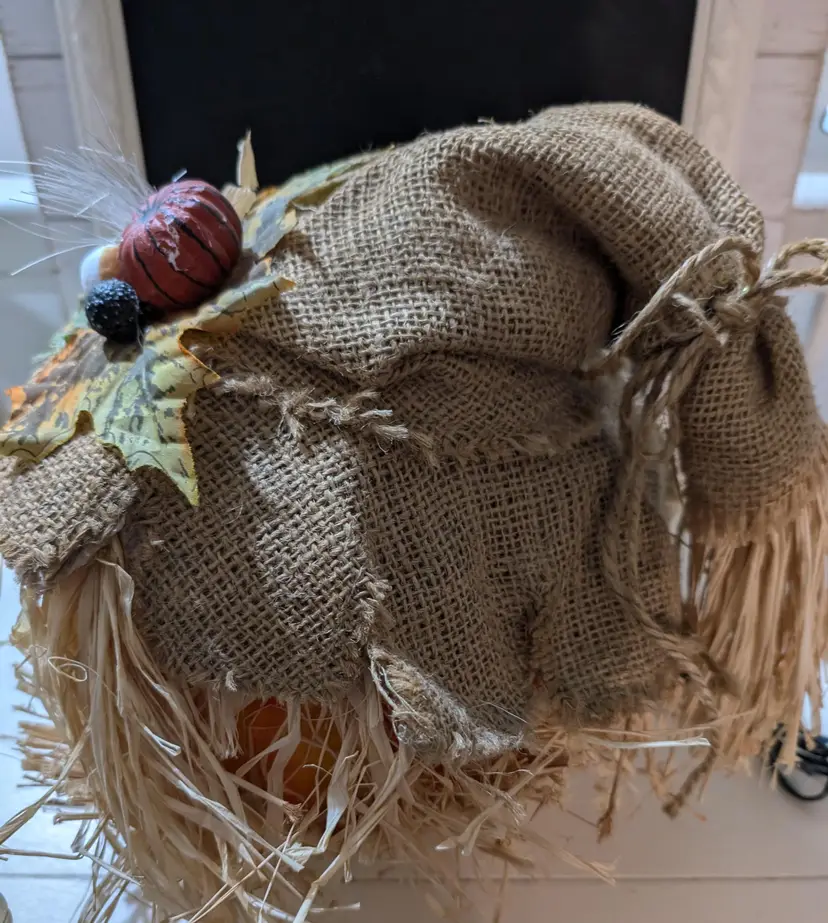 Charming rustic Jack-O'-Lantern pumpkin decoration perfect for your Halloween collection. This piece is used but in great condition with no cracks or chips. The pumpkin features a friendly carved face, a burlap hat adorned with leaves and berries, and straw accents. It stands approximately 12 Inches tall and has a base width of 10 inches. A delightful addition to your seasonal decor.