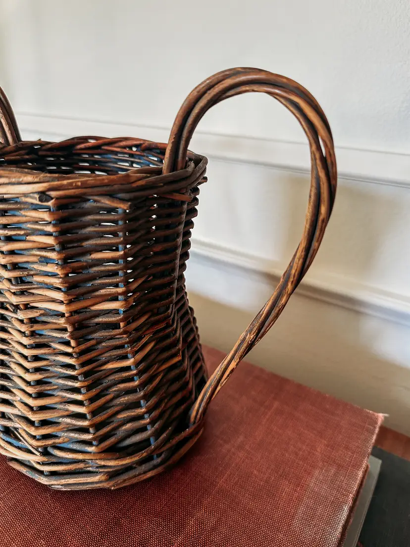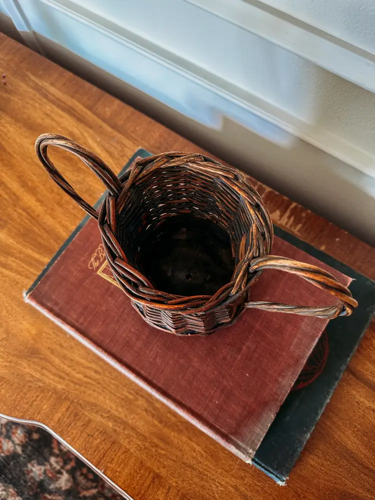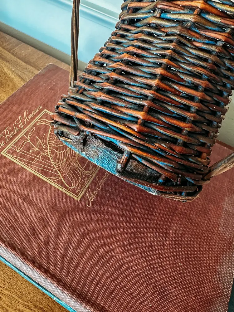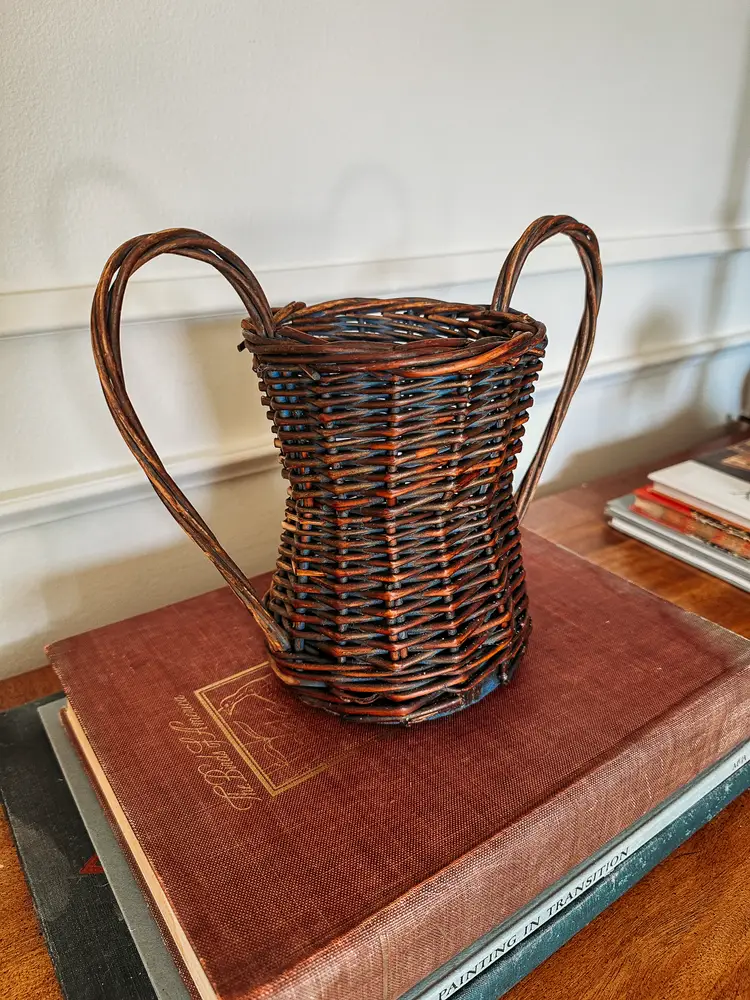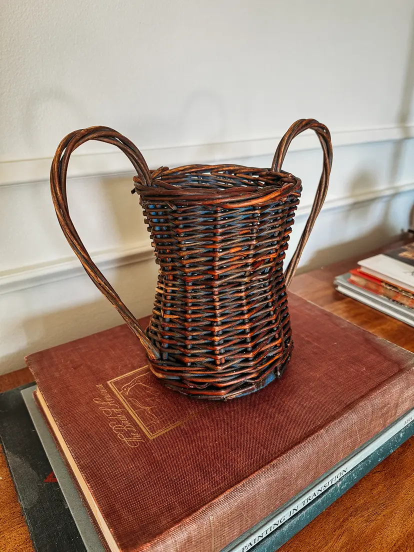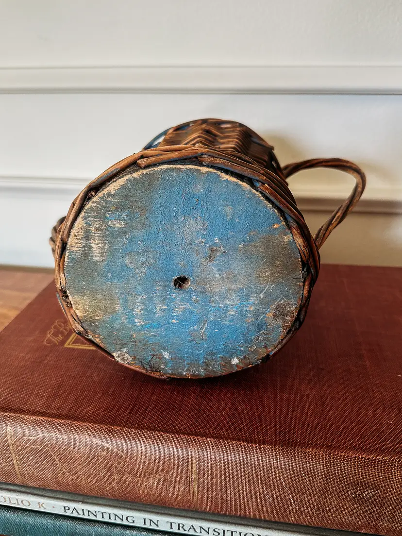 Basket - 5" W x 7" 10.25" W handle Woven painted wood Vintage, USA