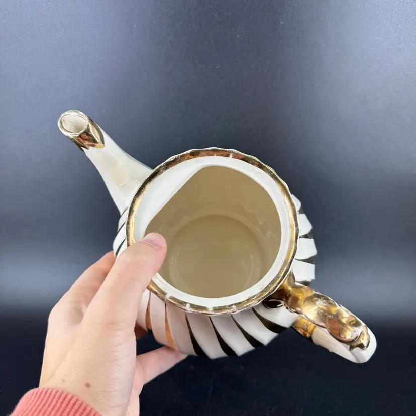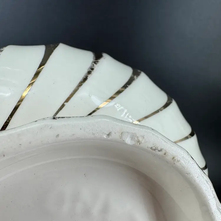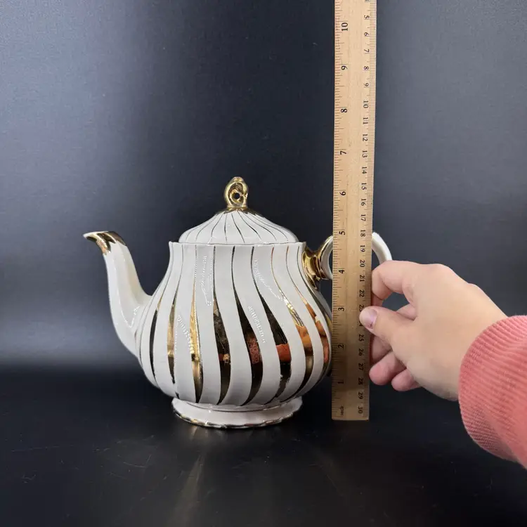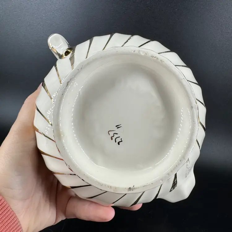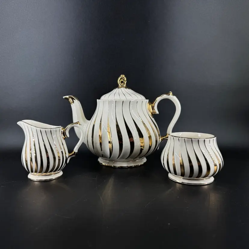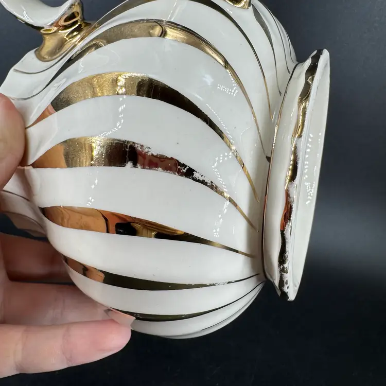 This Sadler England Swirl Porcelain Tea Coffee Pot Sugar & Creamer Gold Swirl Vintage has some crazing in the glaze, has a little chip on the bottom of the tea pot, and has some wear on the gold luster. All of it can be seen in the photos.