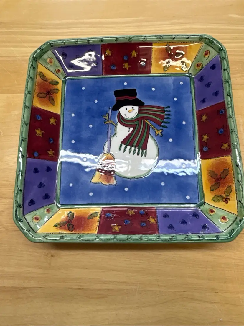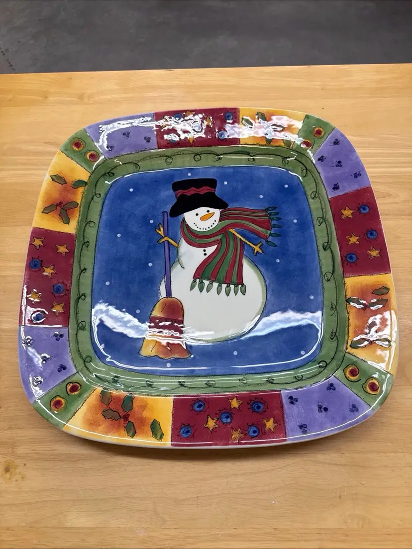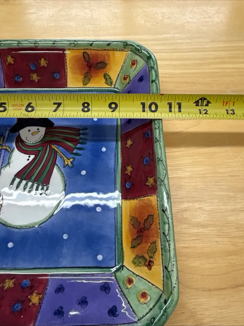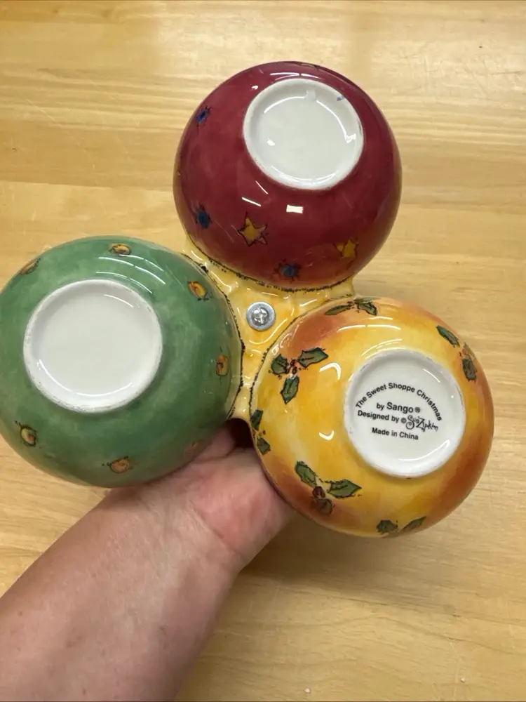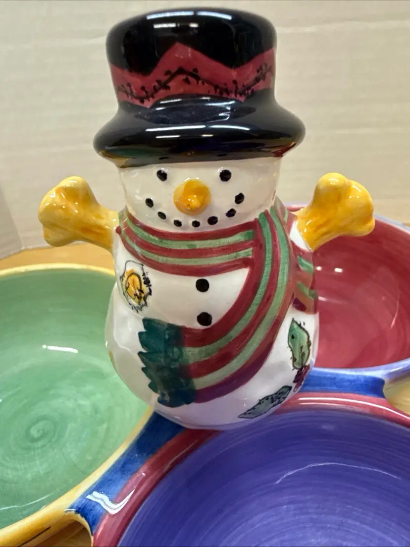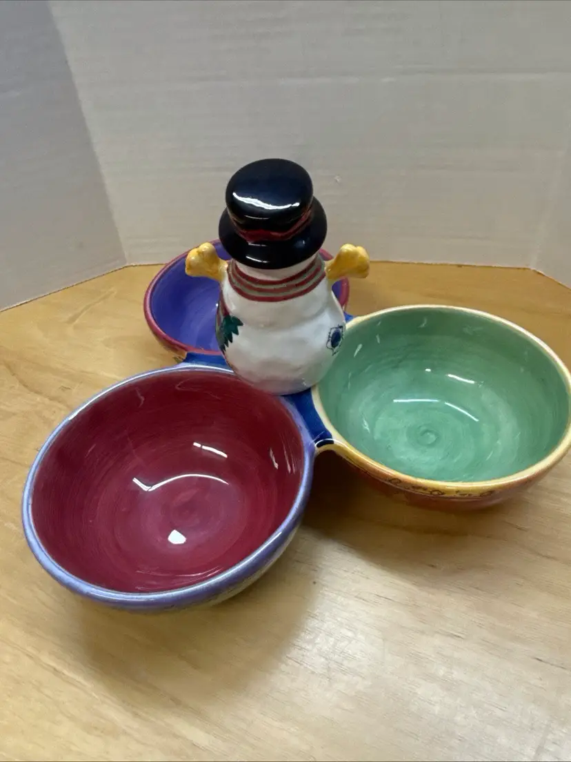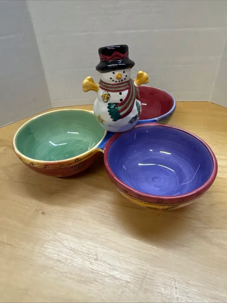 The Sango Sweet Shoppe Snowman 3 piece Christmas Set includes a Platter, Serving Bowl and three part condiment dish. These are a festive and charming addition to your holiday table décor. Made of ceramic with a contemporary design, this multicolor serving dish features a seasonal snowman theme that adds a touch of whimsy to your Christmas celebrations. This 3-part condiment dish is perfect for serving up holiday treats or hosting a festive gathering. Made in China, this unique and eye-catching piece from Sango is sure to be a standout at your Christmas gathering.
