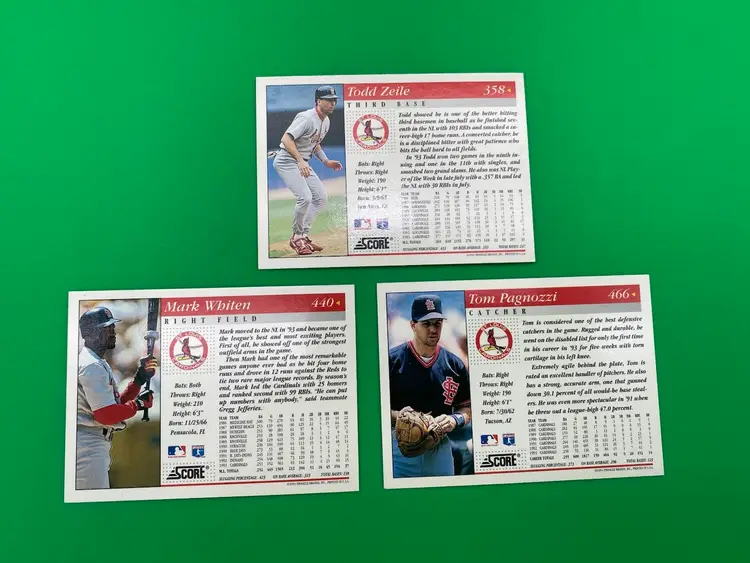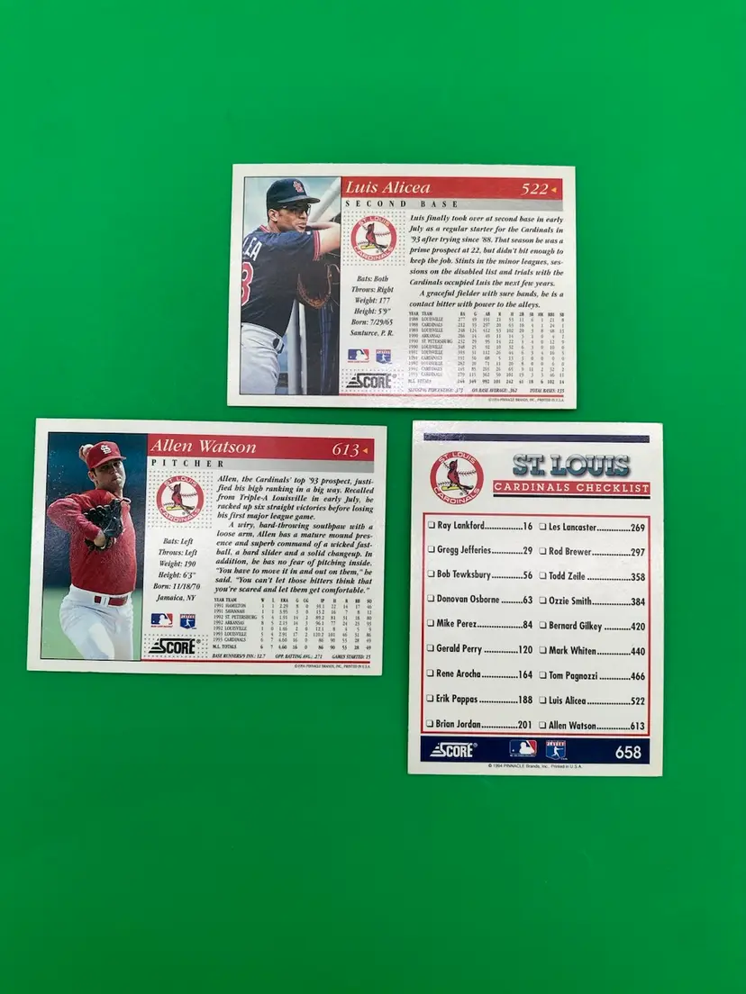 You are purchasing a lot of 9 different MLB St. Louis Cardinals Trading Cards from the 1994 Score line. These Cards are in overall good condition. See images for all of the Cards included in this Listing and their conditions.