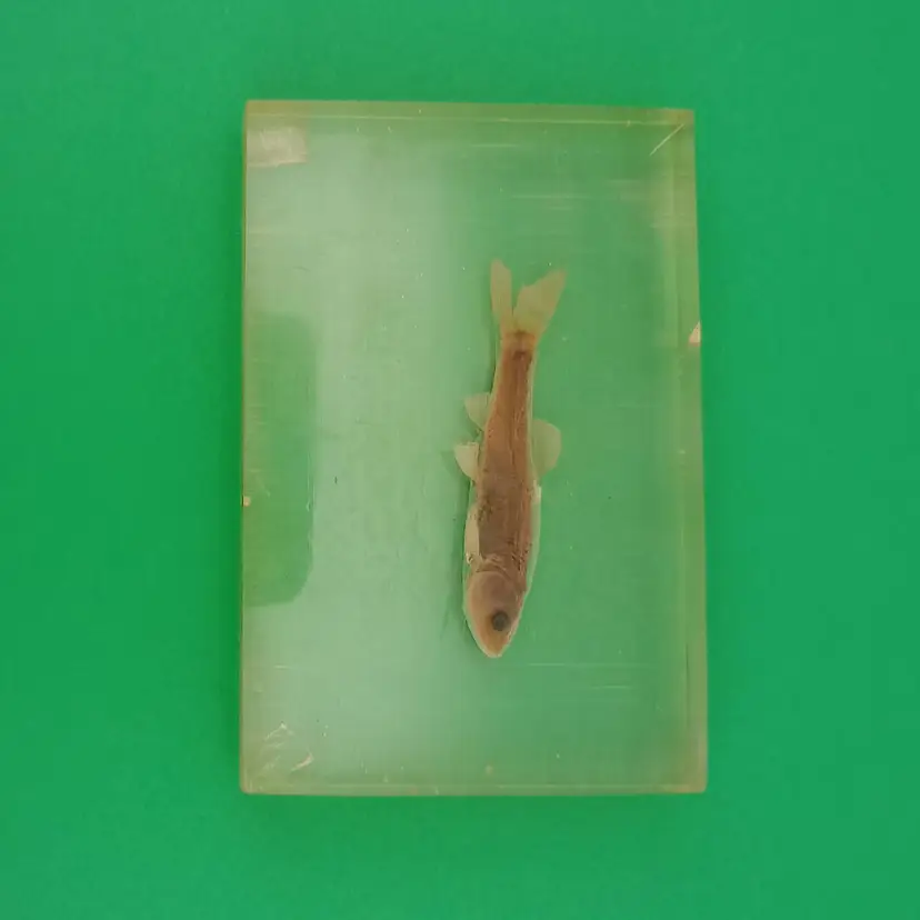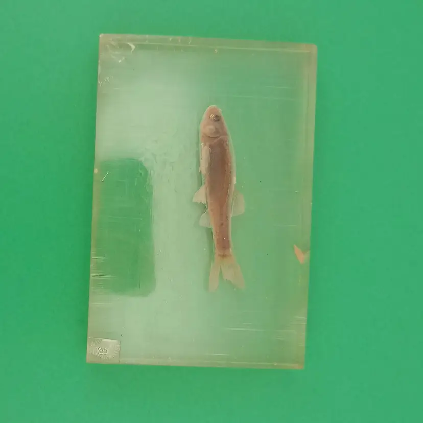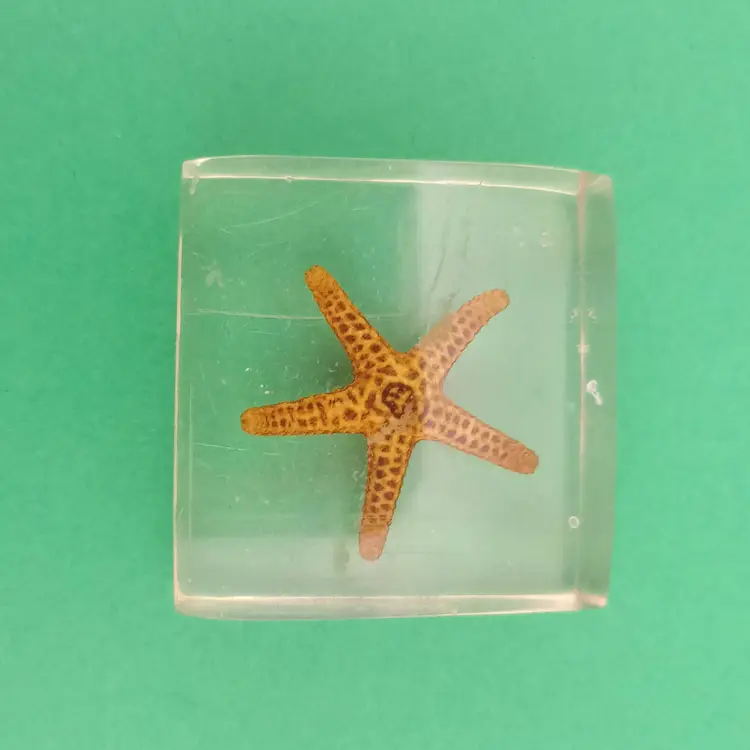 These are real sea creatures preserved in acrylic--scientific specimens. ONe is a seastar, one is a scallop shell, and one is a small fish. They are in very good vintage condition, with a little discoloration of the acrylic.