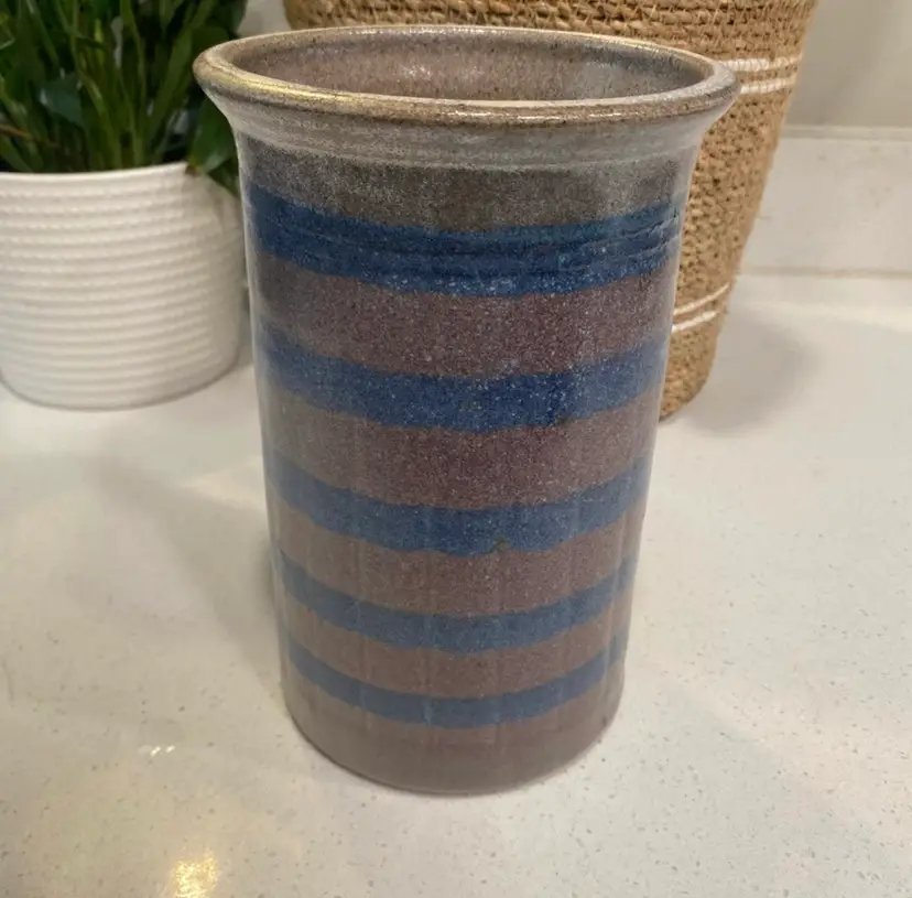 Hand-thrown on the potter's wheel from stoneware clay, this utensil jar is high-fired to provide durability that holds up to everyday use. The blue mist glaze is applied by hand and provides a fantastic fusion of dark, denim and misty shades of blue. Standing 7.75" tall, the jar works wonderfully as a wine chiller or as a an ideal countertop crock to keep utensils in easy reach.