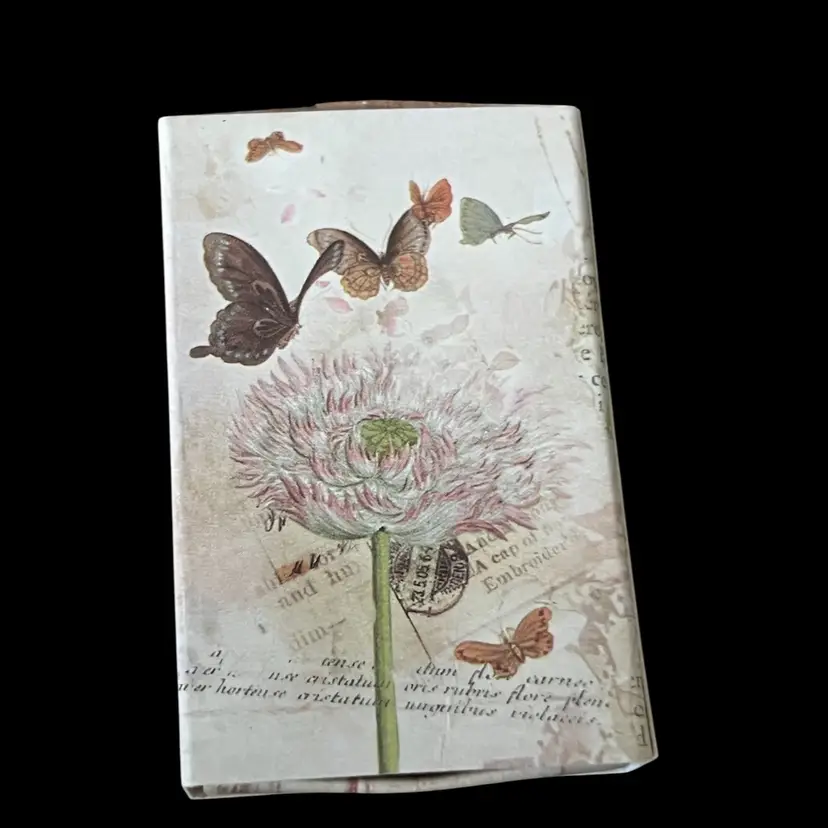 This matchbox opens to reveal beautiful dried flowers embellished with delicate seed beads and a rhinestone butterfly.
