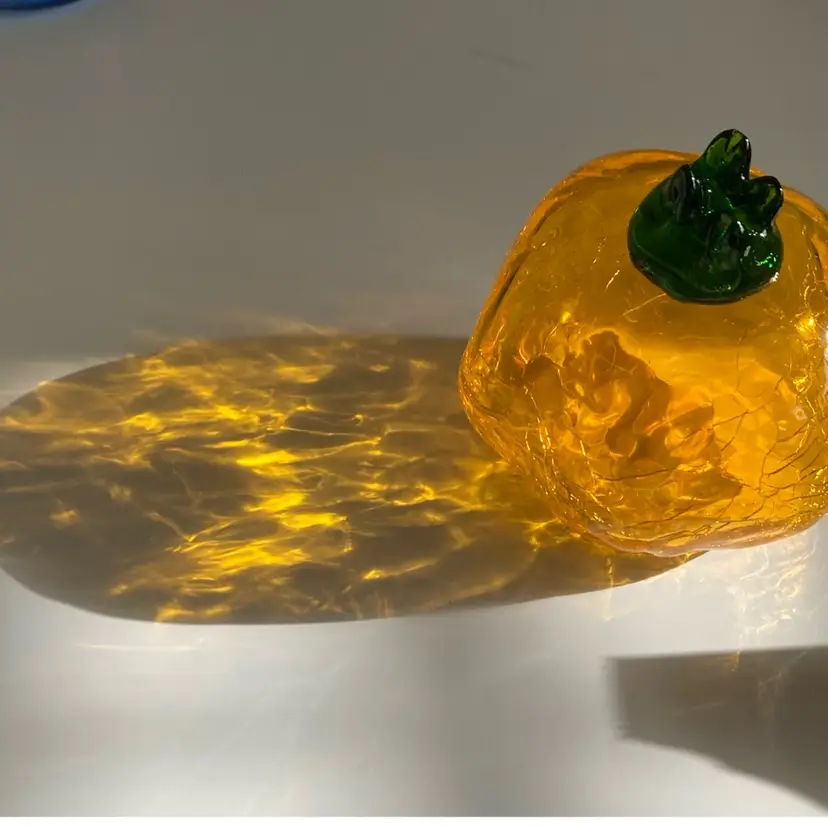 Set of 2 vintage handblown glass fruit paperweights or would look so pretty in a window. The plum measures 2 3/4” across x 2 1/4” tall. The yellow orange fruit has a crackle glass and measures 3 1/4” across x 3” tall. Check out the 3rd photo of light going through it. So pretty!