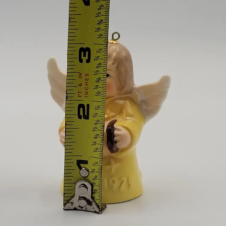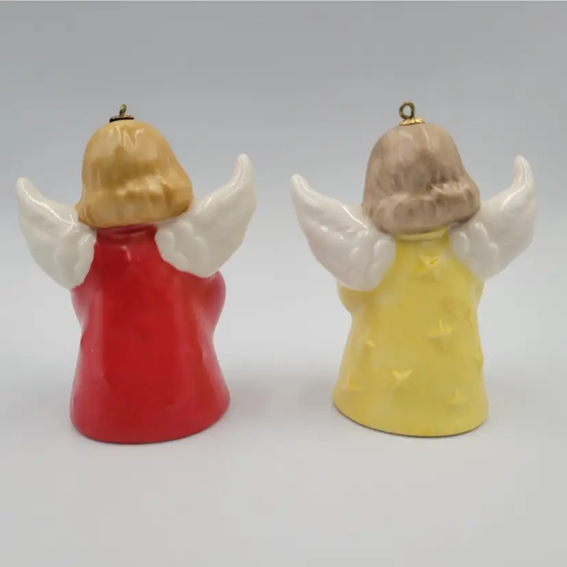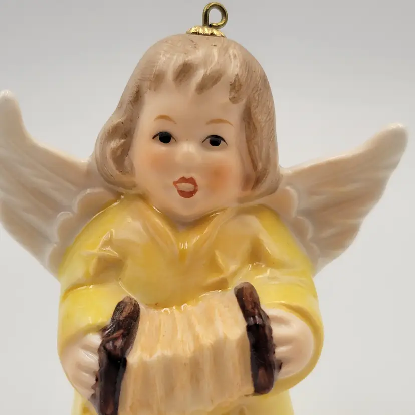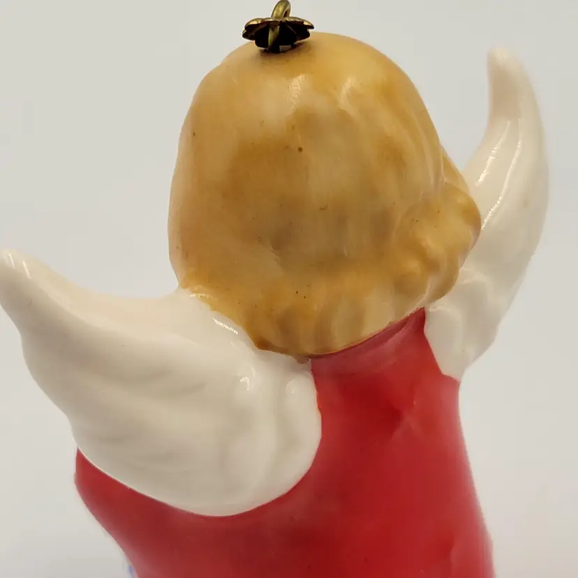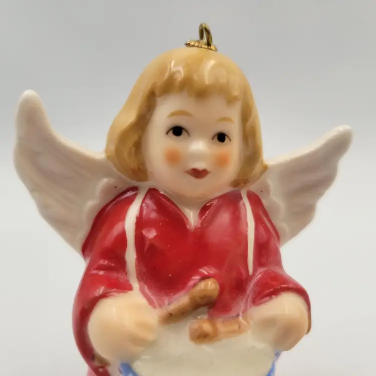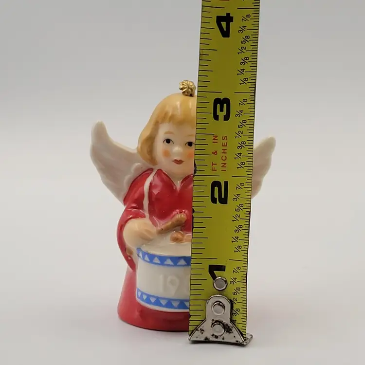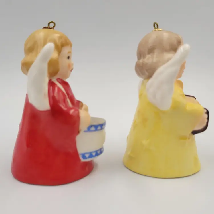 This is a set of 2 vintage Goebel angel bell ornaments. A yellow one dated 1979 holding an Accordion and a red one dated 1984 playing a drum. These ornaments measure about 3 inches tall. There are no chips or cracks. On the red angel, the gold cap on the top is bent up (see photos).